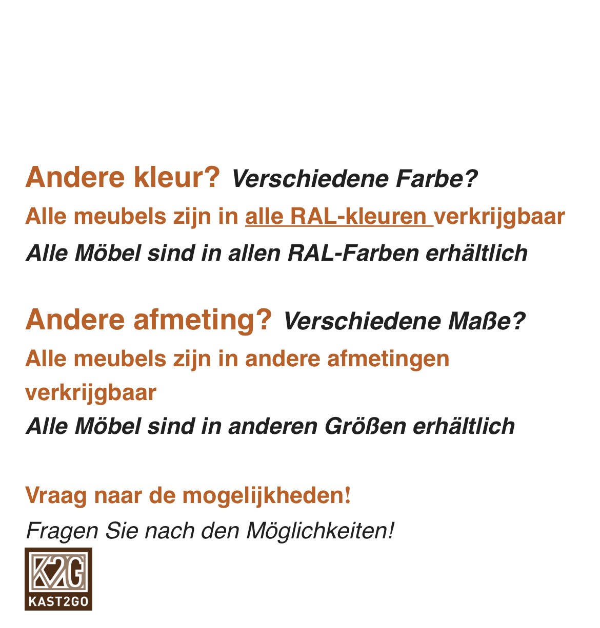 Einige Schränke sind auch in kleineren oder entsprechend größeren Abmessungen erhältlich. Sehen Sie ein bestimmtes Modell, das Ihnen gefällt, aber nicht die richtige Größe? Kein Problem, fragen Sie uns nach den Möglichkeiten. Wir können das wahrscheinlich trotzdem für Sie organisieren.