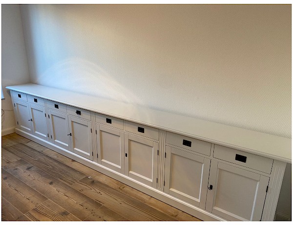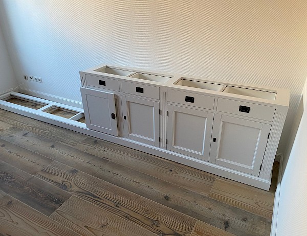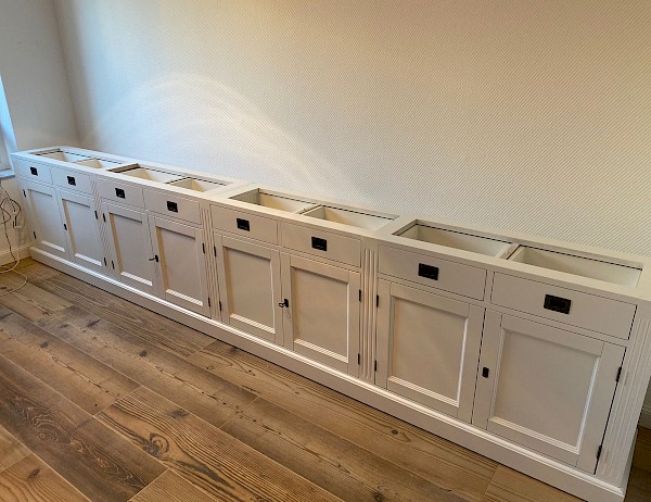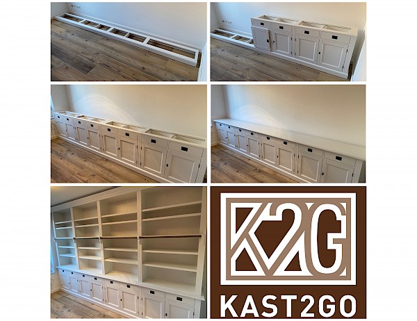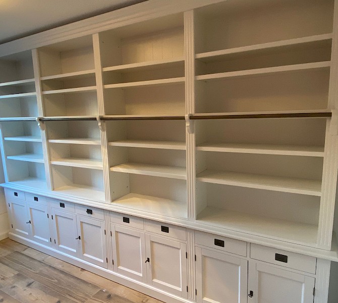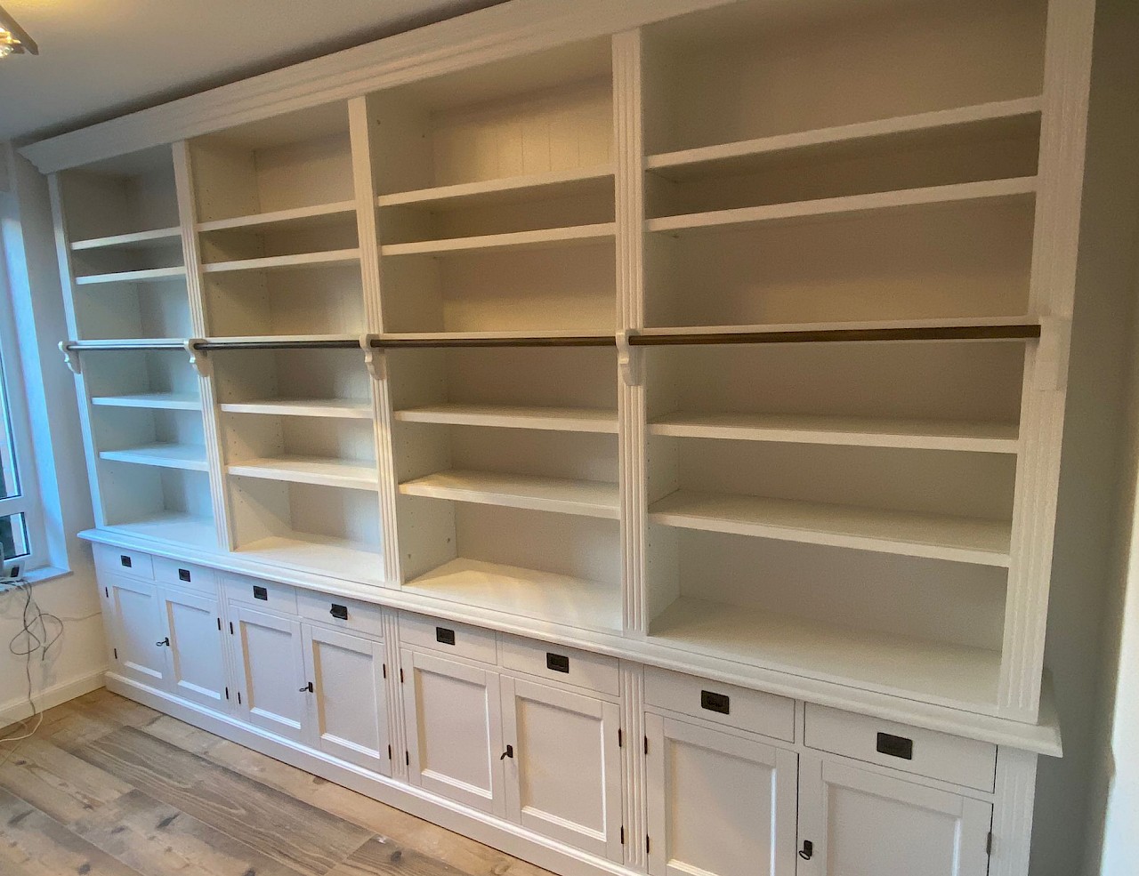 Wunderschönes Bücherregal mit einer Breite von fast 400 cm. Dieser Schrank besteht aus 7 Einzelteilen, aus denen der Schrank vor Ort zusammengebaut wird.