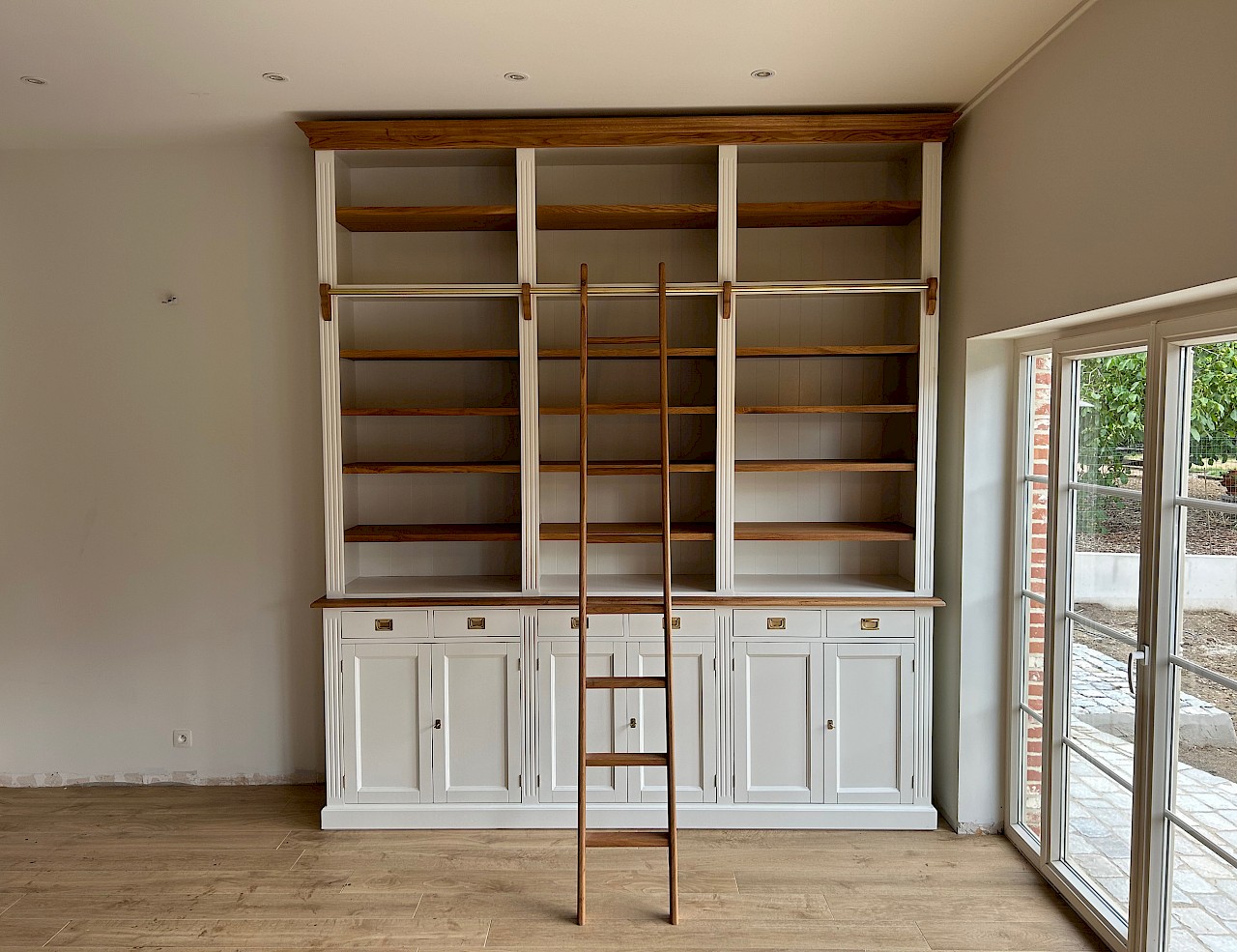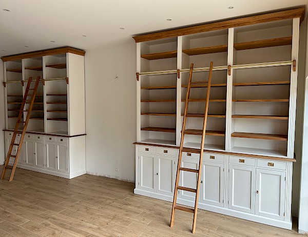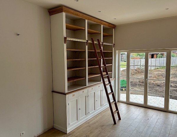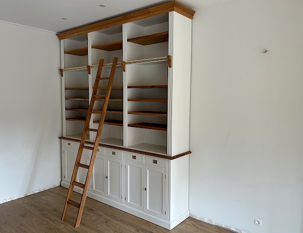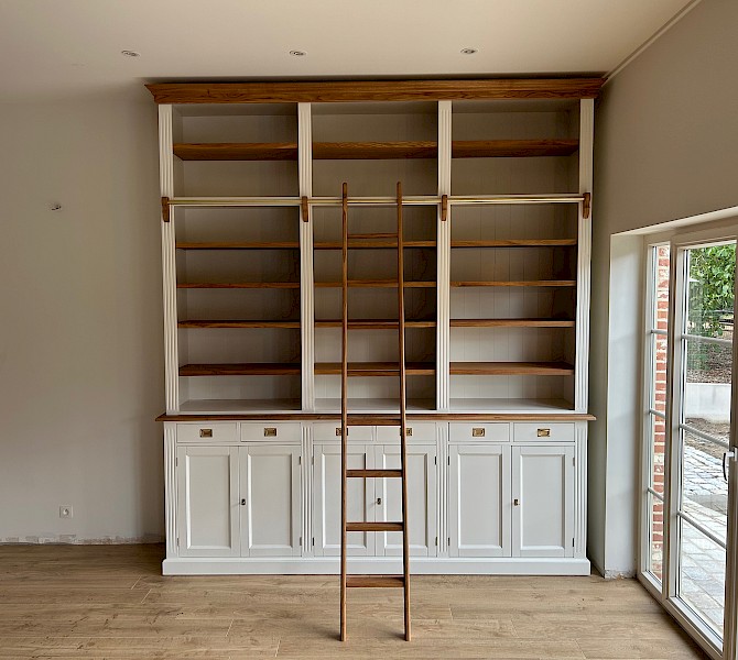 Mit seiner massiven Eichenleiter, den massiven Eichenregalböden und dem massiven Eichengesims ist es ein echter Hingucker.