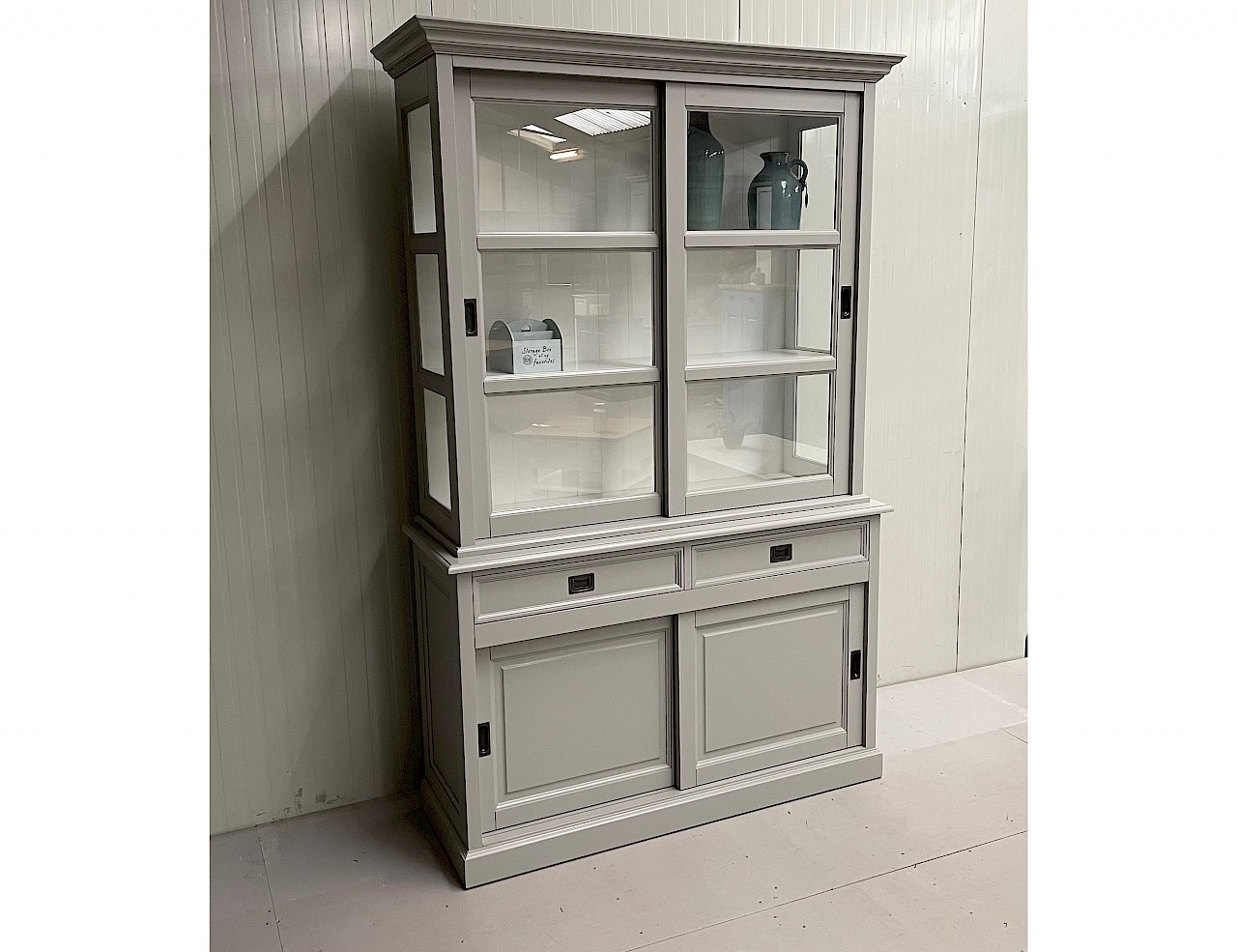 Dieses attraktive, glatte besprühte Sideboard mit Eichenakzenten bietet viel Stauraum für Gegenstände, die Sie im Unterschrank unsichtbar haben möchten, und Sie können Ihre persönlichen Gegenstände im Glasteil des Sideboards ausstellen.