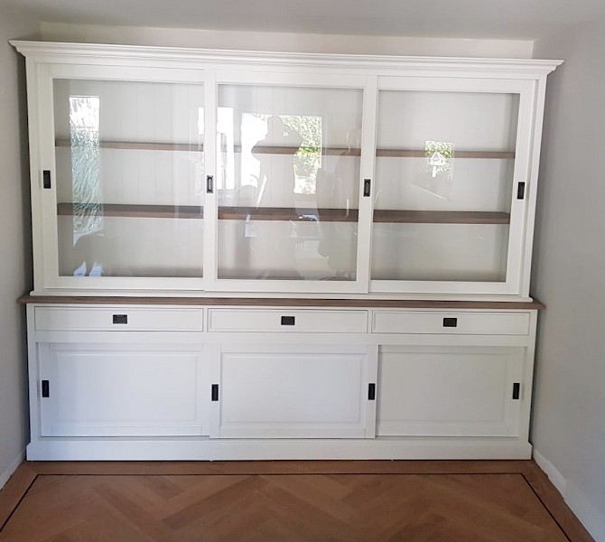 De schuifdeuren hangen in aluminium rails, glijden vloeiend en zweven als het ware. Op de lades is soft closing geinstalleerd, dus nog meer gevoel van echte luxe. De zijkanten van de bovenkast zijn gemaakt van glas, wat zorgt voor een mooi uitzicht en licht in de kast.