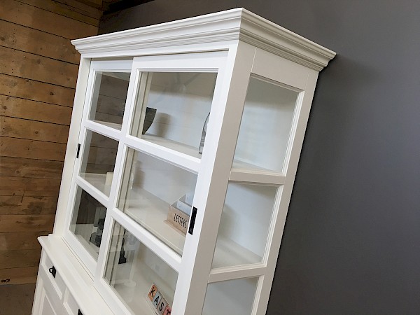 Dieses attraktive, glatte besprühte Sideboard bietet viel Stauraum für Gegenstände, die Sie im Unterschrank unsichtbar haben möchten, und Sie können Ihre persönlichen Gegenstände im Glasteil des Sideboards ausstellen.
