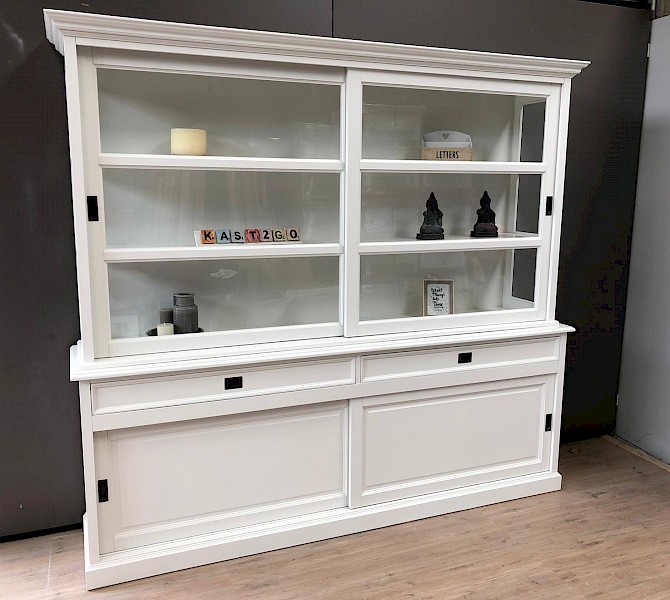 Dieses schöne weiße buffetschrank/vitrinenschrank Degen 2 Meter kann der Hingucker in Ihrem Wohnraum sein! Ein zeitloser Look, der sowohl in ein modernes als auch in ein klassisches Interieur passt. Der Schrank enthält zwei Schiebetüren, oben und unten, sowie eine Reihe von Schubladen. Die Herstellung erfolgt mit hoher Qualität, die Schubladen sind sanft schließend und die Schiebetüren hängen in Aluminiumschienen, laufen fließend und schweben sozusagen. Dieser schöne Schrank besteht aus zwei Teilen und ist somit leicht zu transportieren.