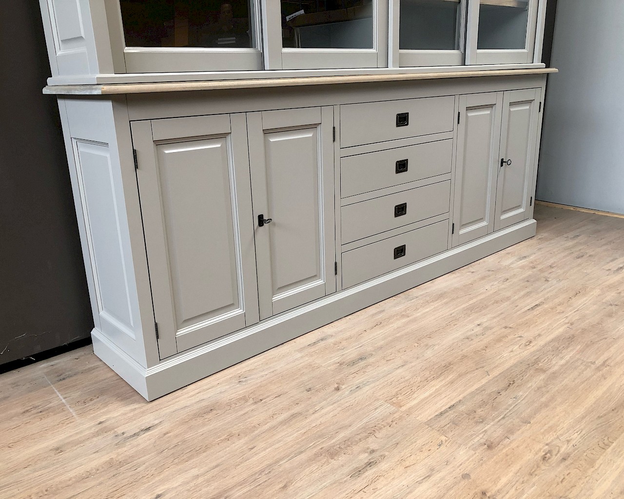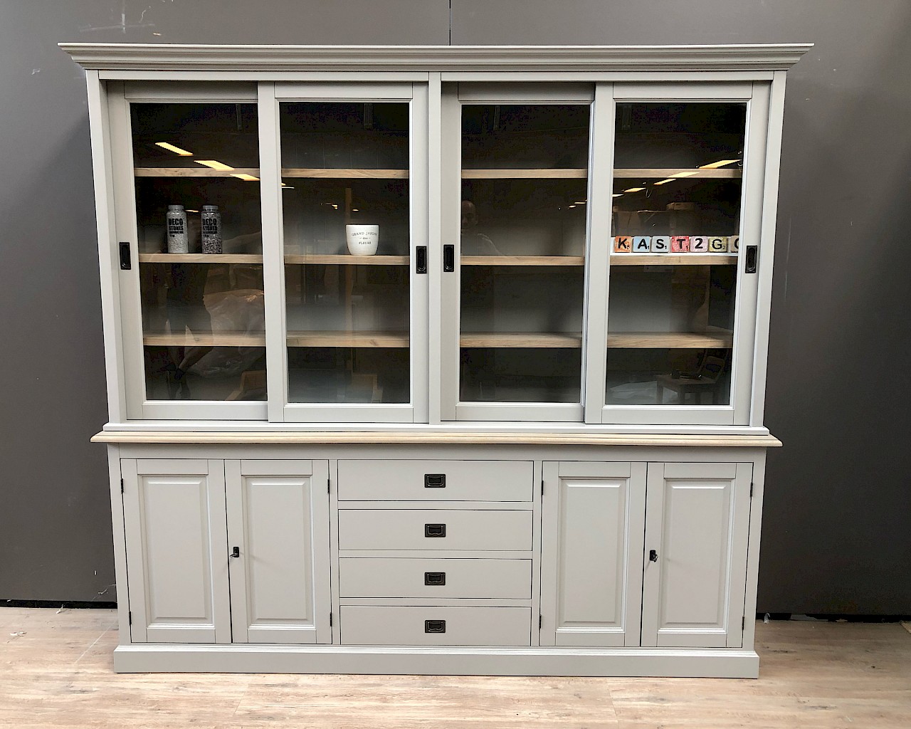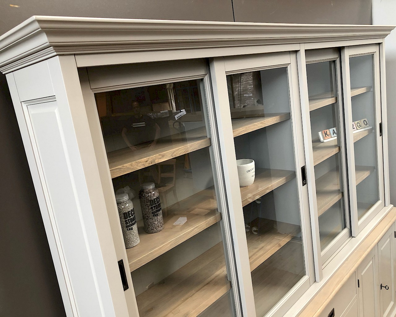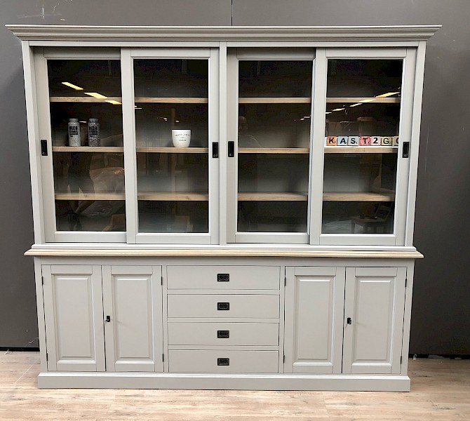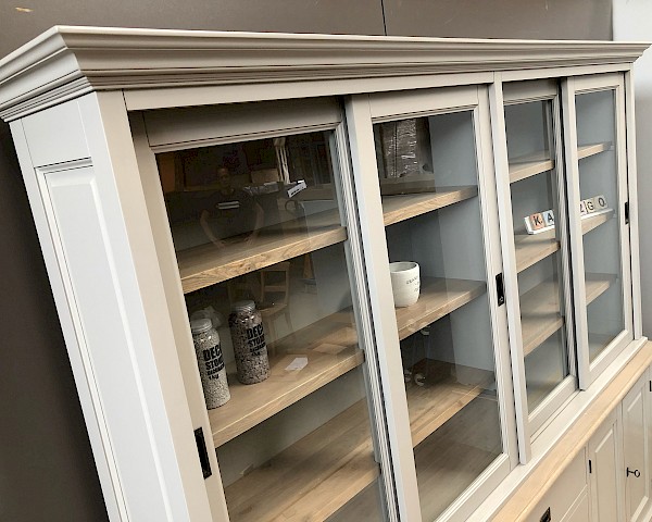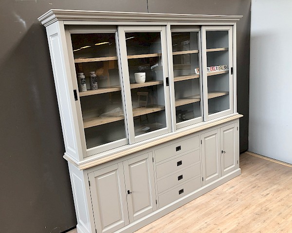 Dieser attraktive, glatte Buffetschrank in grau bietet viel Stauraum fur alle sachen, die Sie im Unterschrank unsichtbar haben möchten, und Sie können Ihre persönlichen sachen  im Glasteil des buffetschrank anzeigen.
