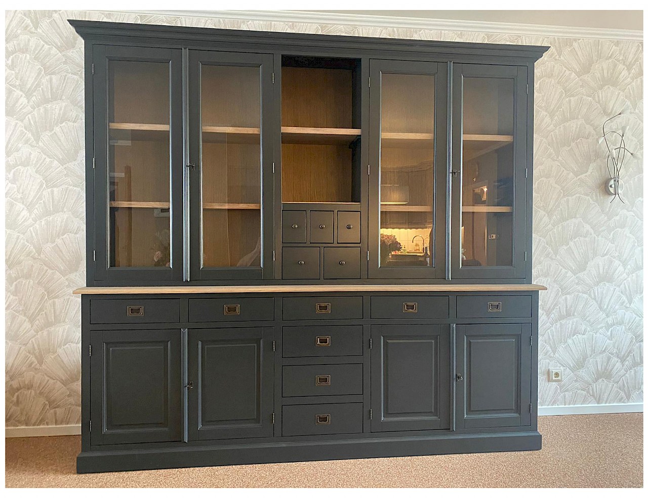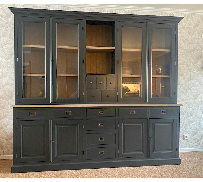 Schönes Sideboard mit überraschendem Layout. Genug Platz, um schöne Dinge auszustellen, aber auch mehr als genug Stauraum hinter geschlossenen Schranktüren im unteren Schrank. Dieser Schrank kann in allen RAL-Farben ausgeführt werden, auch optional mit oder ohne Eichendetails. Hochwertiges Finish, einschließlich sanftem Schließen der Schubladen. Es ist beispielsweise auch möglich, Fingerzüge an den Schubladen anstelle von Zugknöpfen anzubringen.