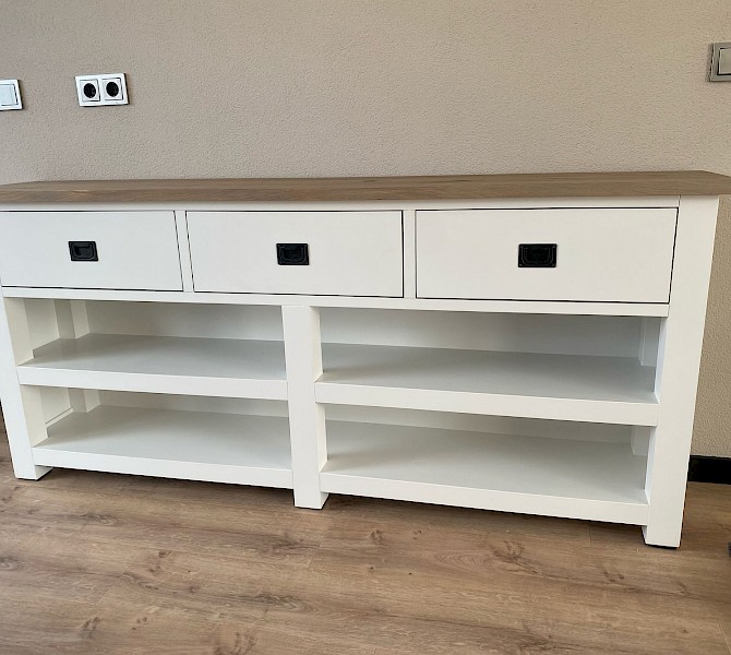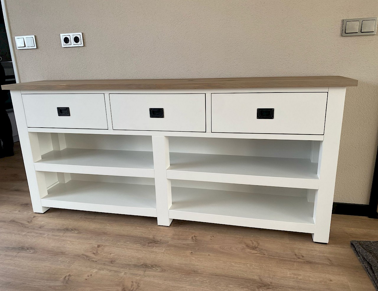 Kundenspezificher Beistelltisch 180 weiß/Eiche mit geschlossener Rückseite und Seite