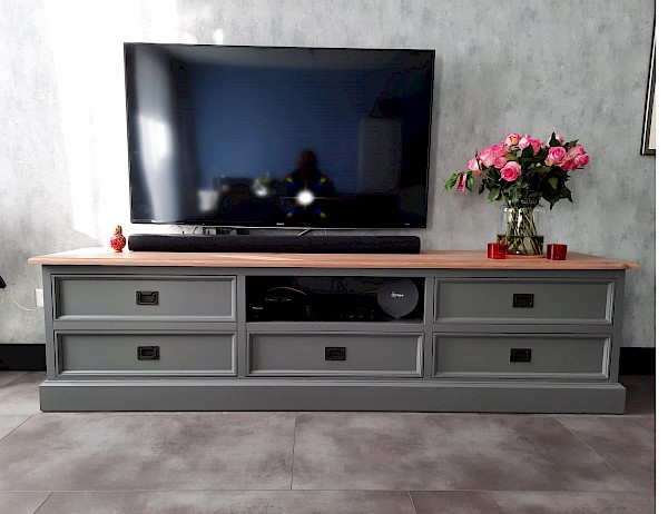 Sanft gesprühte TV-Möbel in ganz Murano. Passt gut zu einem der glatt lackierten Sideboards oder Sideboards. Auch passend zum Couchtisch und / oder Mädchenschrank erhältlich. Auch in anderen Größen erhältlich. Auch ohne OAK-Top erhältlich. Ansonsten kontaktieren Sie uns bitte für weitere Informationen!