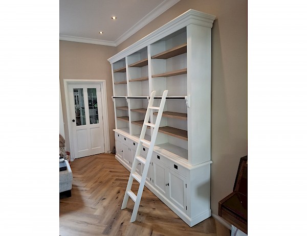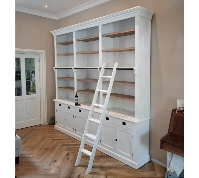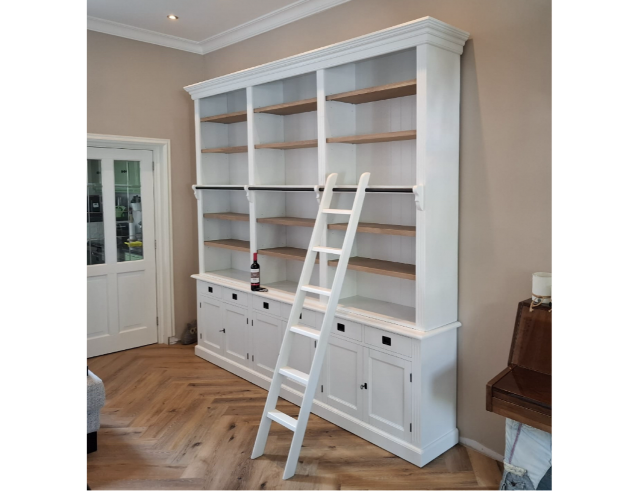 Breng karakter en functionaliteit samen met deze imposante handgemaakte boekenkast. Het combineert de klassieke uitstraling met modern gebruiksgemak, perfect voor woonkamers, kantoren of bibliotheken. Gemaakt van hoogwaardig hout in een strakke witte afwerking. Massief eiken legplanken voor een warme, natuurlijke uitstraling. Inclusief decoratieve ladder op een zwarte rail, praktisch maar ook stijlvol. Royale opbergruimte met dichte afsluitbare kastje onderin. Afgewerkt met klassieke sierlijst en paneeldeuren voor een tijdlopos design. De boekenkast Janine is ook in andere breedtes of andere hoogte verkrijgbaar. Dit exemplaar is 300cm breed en 260cm hoog.