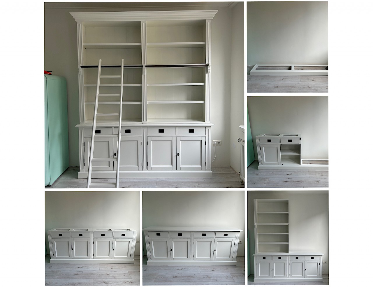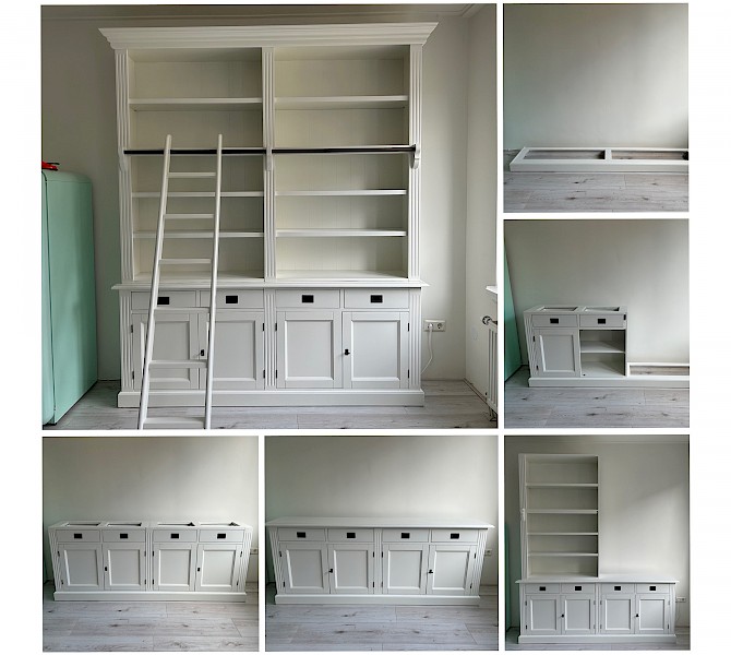 Normaal bestaat deze boekenkast uit 2 gedeeltes, een onderstuk en een bovenstuk. Dit exemplaar is speciaal in 7 delen vervaardigd, zodat ie ook op verdieping geplaatst kan worden (mits afzonderlijke delen natuurlijk over de trap of in een lift vervoerd kunnen worden)