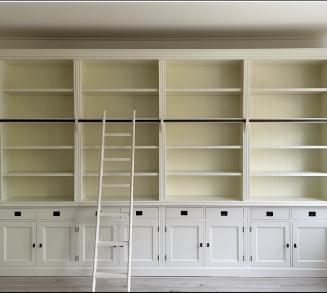 Mega boekenkast van 400cm breed met ladder en met 4 legplanken, dus heel veel afzetruimte voor boeken!