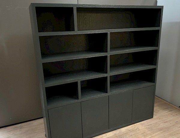 Deze nieuw ontworpen boekenkast heeft een tijdloze uitstraling. De kast is gemaakt van eiken fineer, deuren zijn met push open systeem makkelijk te openen.