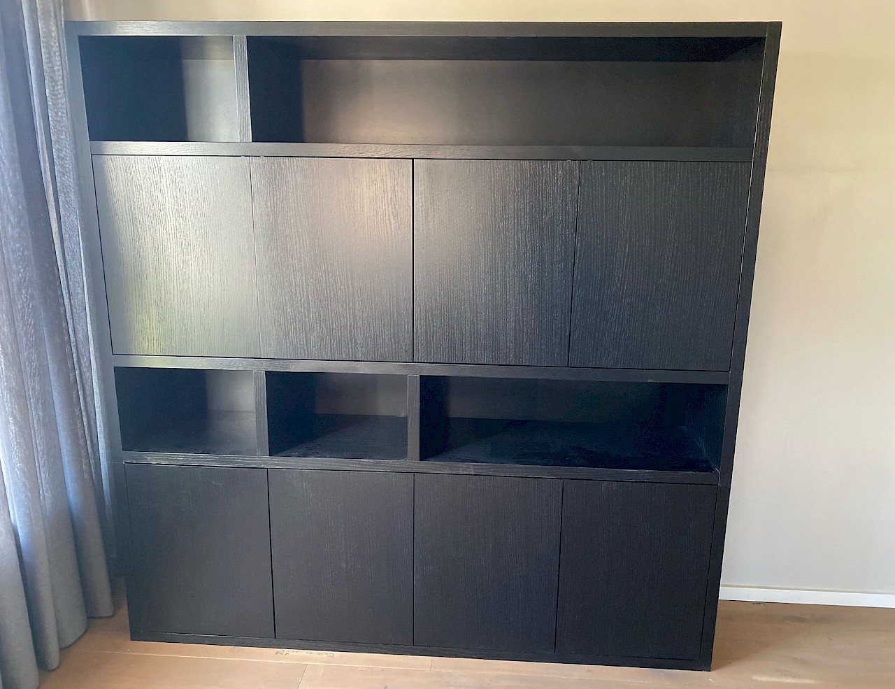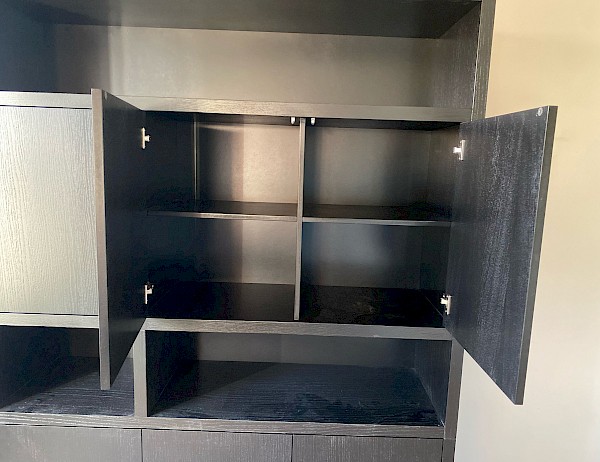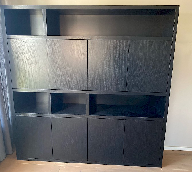 Deze nieuw ontworpen boekenkast heeft een tijdloze uitstraling. De kast is gemaakt van eiken fineer, deuren zijn met push open systeem makkelijk te openen.