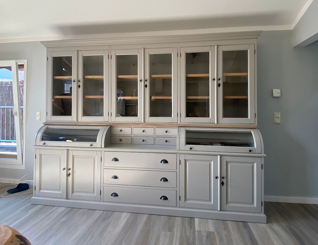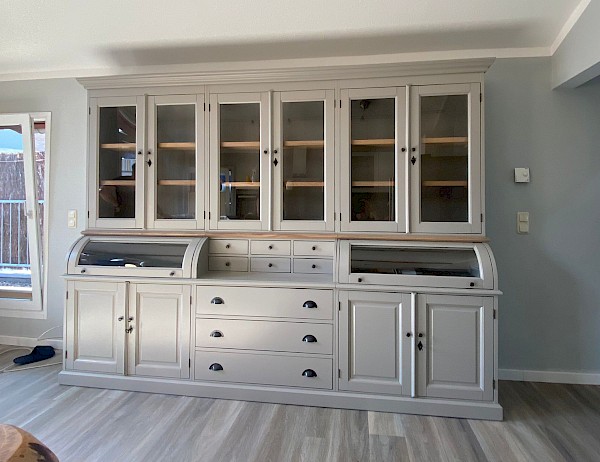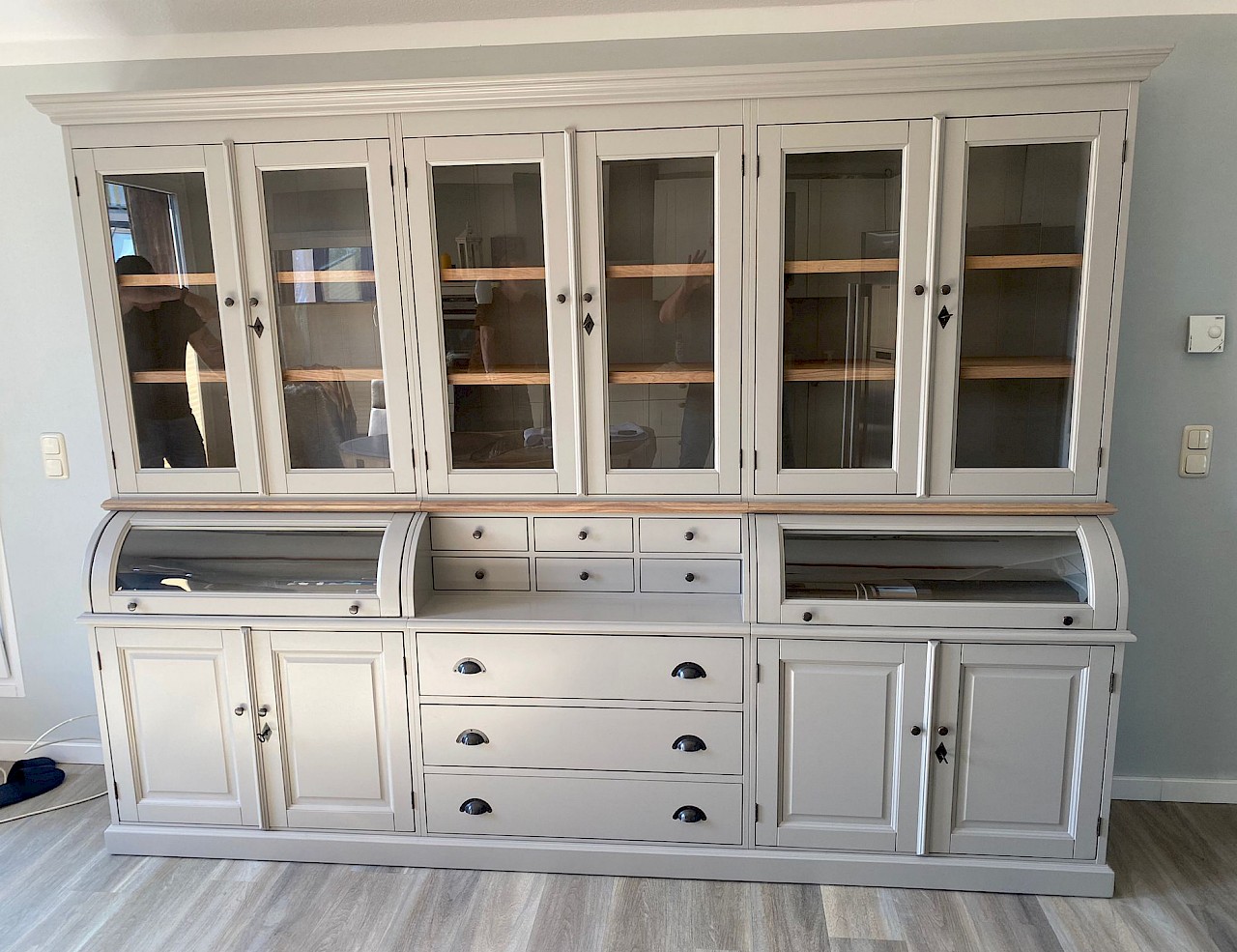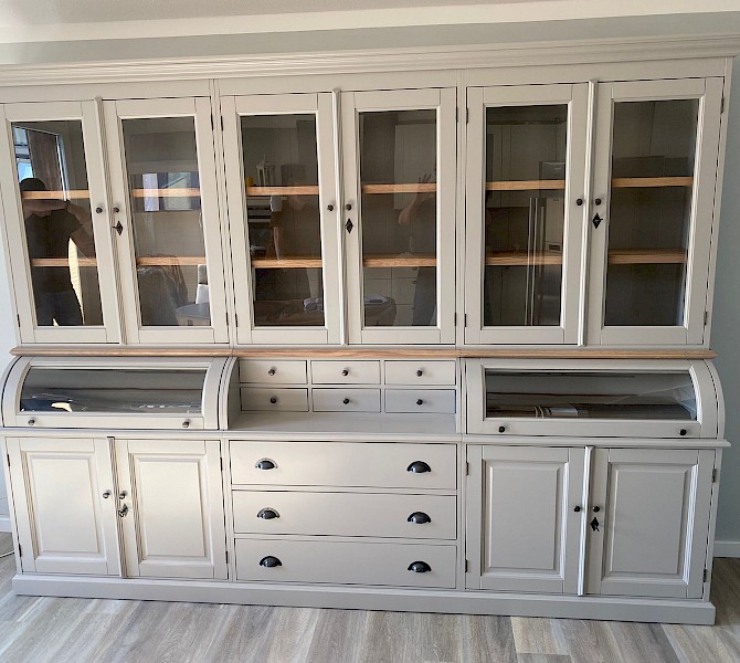 Deze prachtige buffetkast Bastiaan heeft een geweldige uitstraling. Uiteraard bestaat de kast uit 2 delen, het bovenste gedeelte valt achter een sierlijst in het onderste gedeelte. De afwerking is glad gespoten, en hoogwaardige kwaliteit: softclosing op de lades, en afsluitbare deuren!