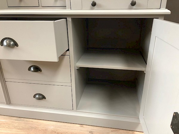 Deze prachtige buffetkast Bastiaan heeft een geweldige uitstraling. Uiteraard bestaat de kast uit 2 delen, het bovenste gedeelte valt achter een sierlijst in het onderste gedeelte. De afwerking is glad gespoten, en hoogwaardige kwaliteit: softclosing op de lades, en afsluitbare deuren!