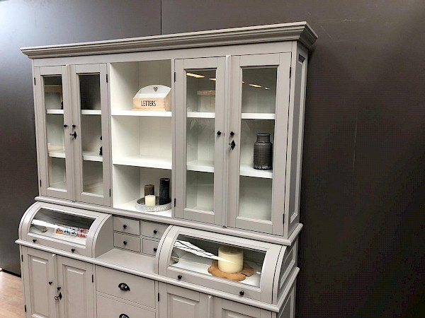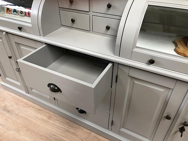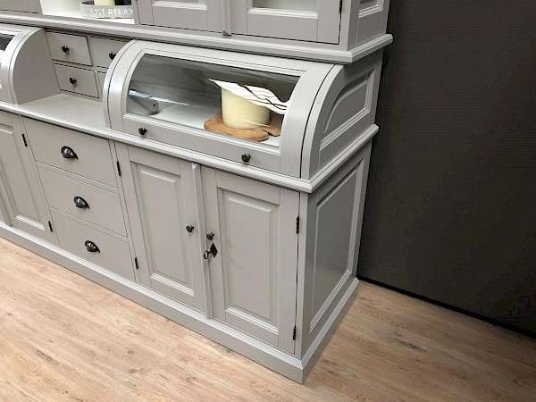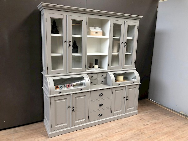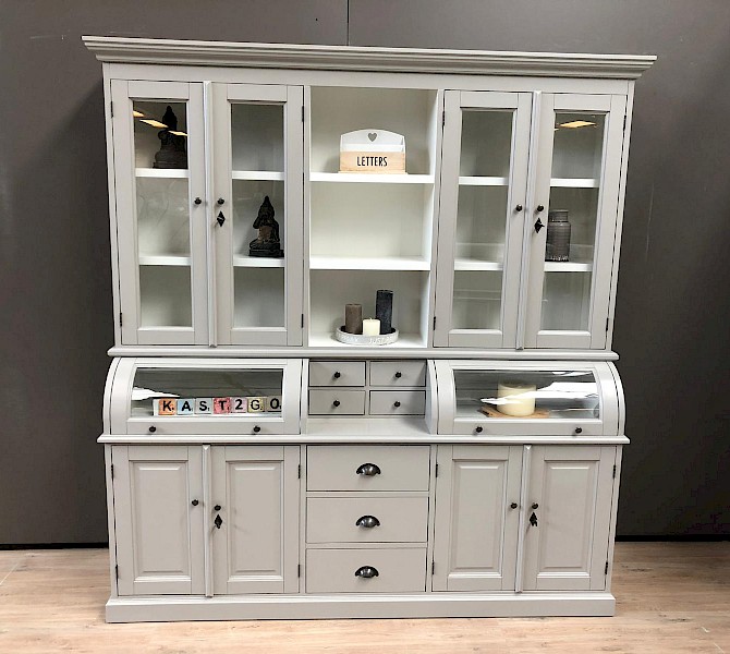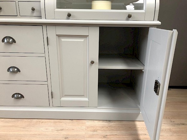 Deze prachtige buffetkast Bastiaan 200cm heeft een geweldige uitstraling. Uiteraard bestaat de kast uit 2 delen, het bovenste gedeelte valt achter een sierlijst in het onderste gedeelte. De afwerking is glad gespoten, en hoogwaardige kwaliteit: softclosing op de lades, en afsluitbare deuren!