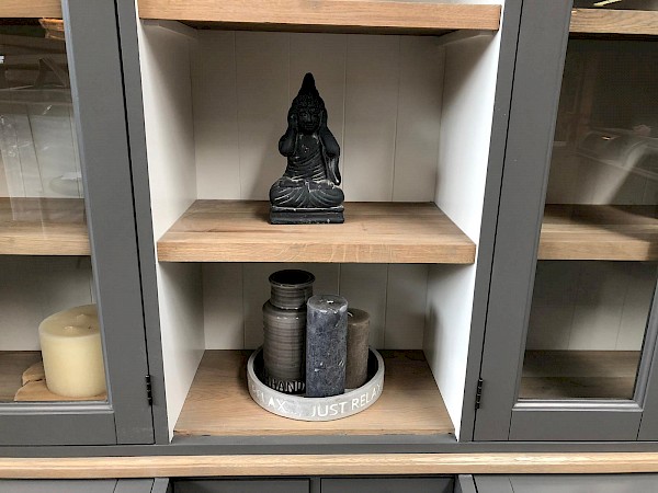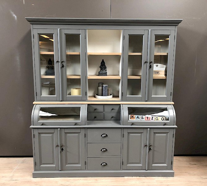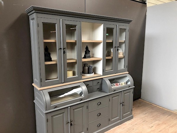 Deze prachtige buffetkast Bastiaan 200cm heeft een geweldige uitstraling. Uiteraard bestaat de kast uit 2 delen, het bovenste gedeelte valt achter een sierlijst in het onderste gedeelte. De afwerking is glad gespoten, en hoogwaardige kwaliteit: softclosing op de lades, en afsluitbare deuren!