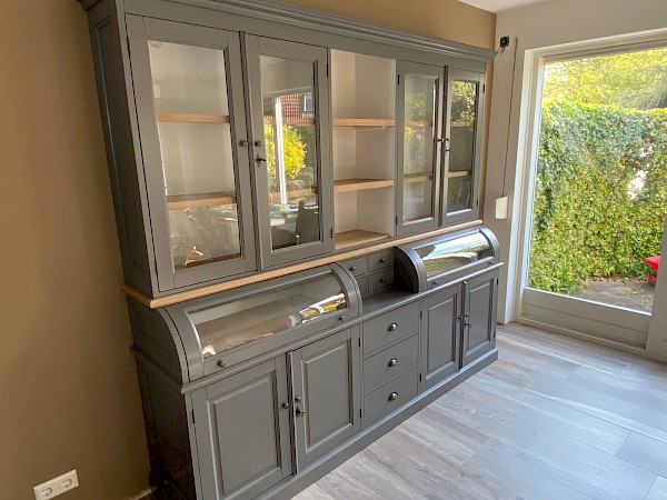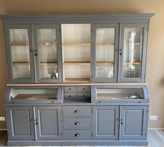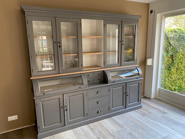 Deze prachtige buffetkast Bastiaan heeft een geweldige uitstraling. Uiteraard bestaat de kast uit 2 delen, het bovenste gedeelte valt achter een sierlijst in het onderste gedeelte. De afwerking is glad gespoten, en hoogwaardige kwaliteit: softclosing op de lades, en afsluitbare deuren!