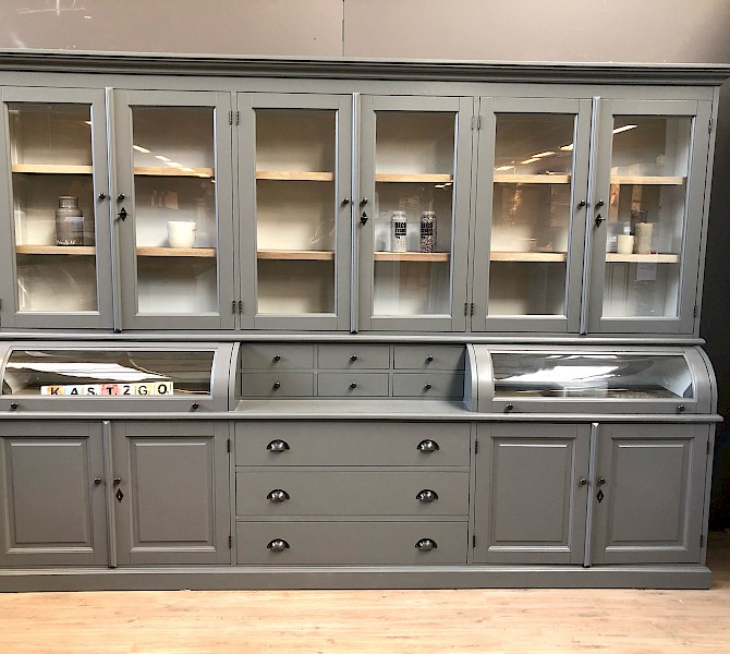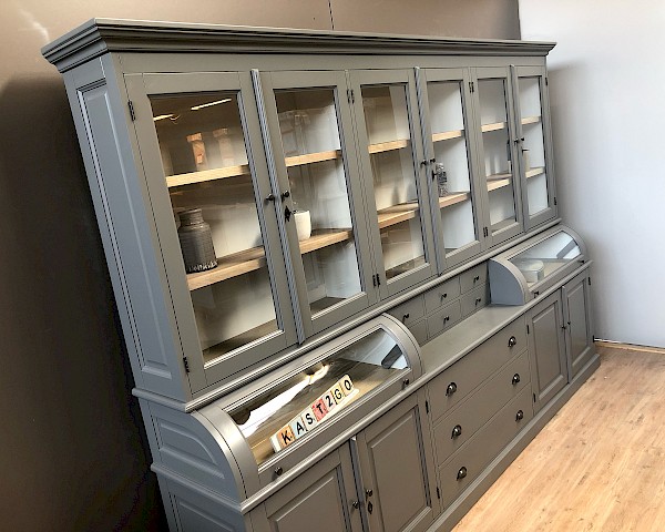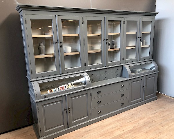 Deze prachtige buffetkast Bastiaan 300cm heeft een geweldige uitstraling. Uiteraard bestaat de kast uit 2 delen, het bovenste gedeelte valt achter een sierlijst in het onderste gedeelte. De afwerking is glad gespoten, en hoogwaardige kwaliteit: softclosing op de lades, en afsluitbare deuren!