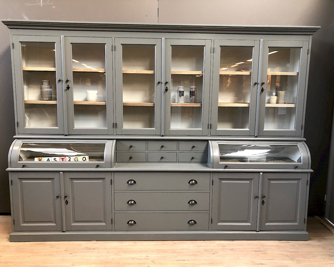 De eiken elementen zijn de planken in bovenkast, het leggedeelte achter de bolle kleppen en ook de sierlijst in het midden van de kast aan de buitenzijde (deze laatste staat niet op foto)