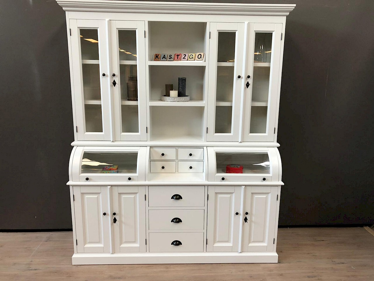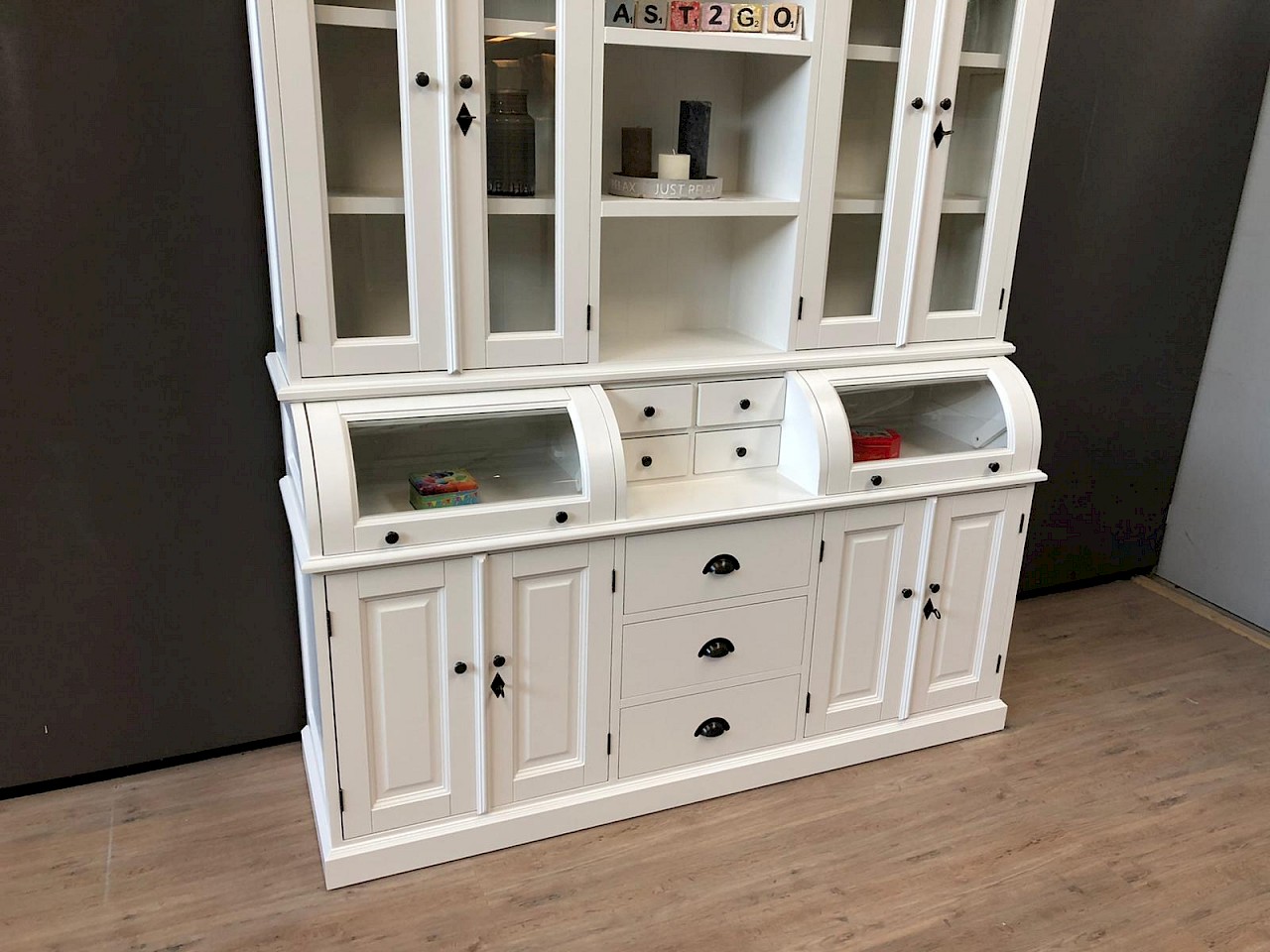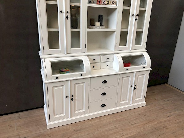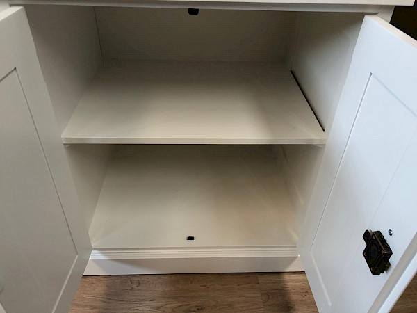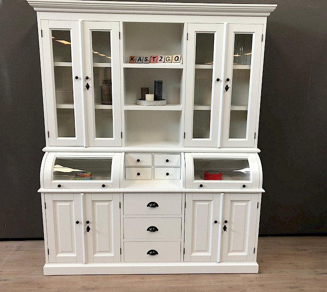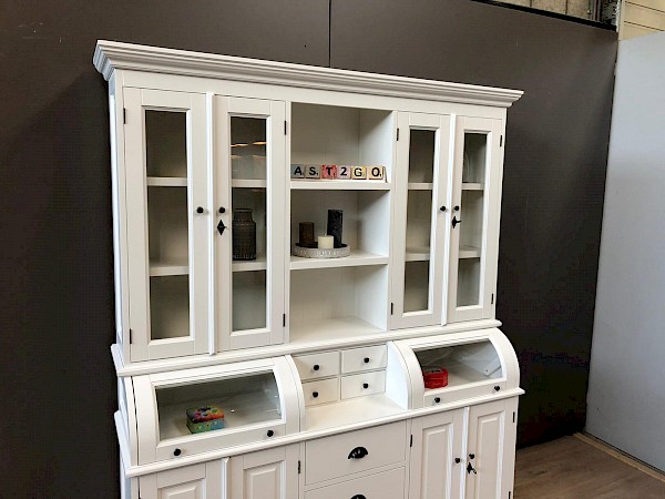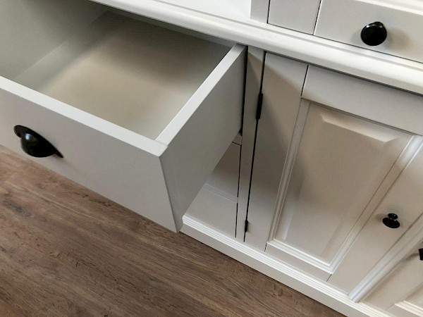 Deze mooie buffetkast Bastiaan bestaat uit 2 gedeeltes. Het bovenste gedeelte van deze witte buffetkast valt achter de sierlijst. De kleppen van deze kast schuiven naar binnen en kunnen ook in een vaste stand open blijven staan. Met deze buffetkast haalt u een zeer romantische landelijke sfeer in huis! Softclosing op de lades!