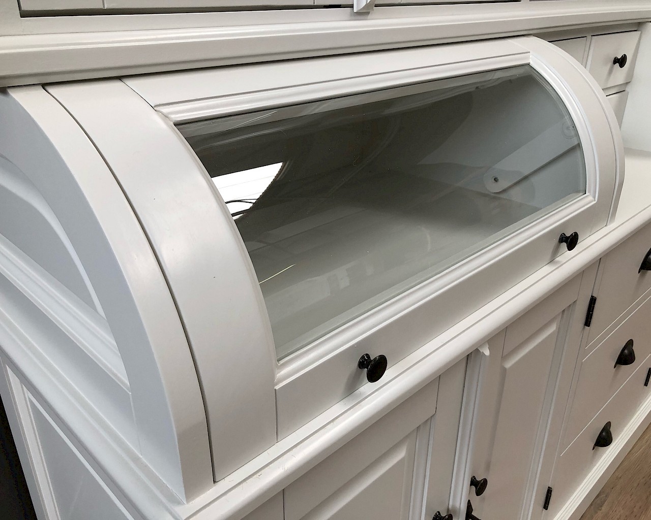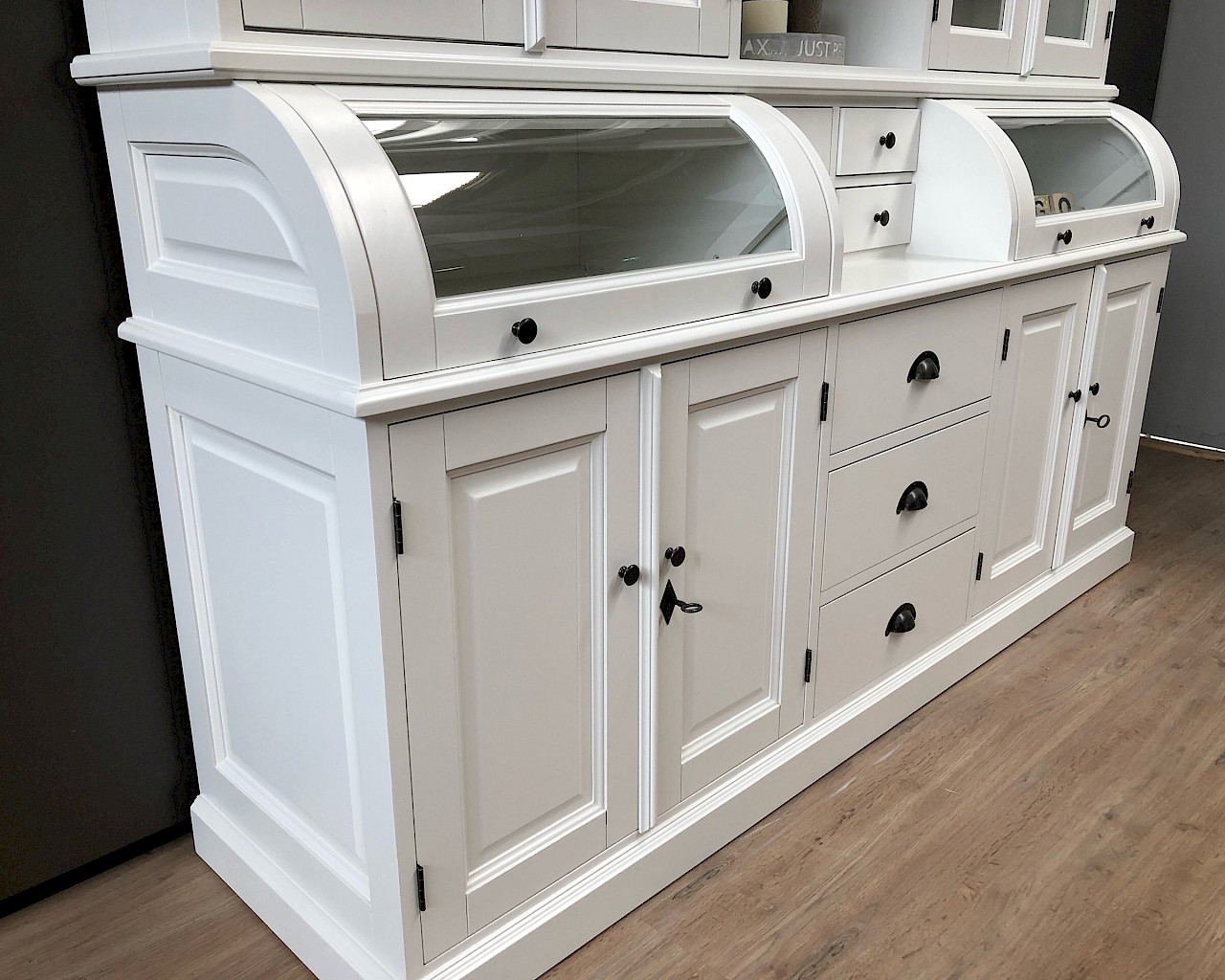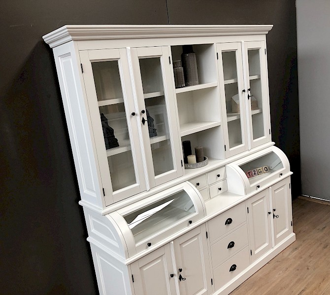 Deze prachtige buffetkast Bastiaan 220cm heeft een geweldige uitstraling. iteraard bestaat de kast uit 2 delen, het bovenste gedeelte valt achter een sierlijst in het onderste gedeelte. De afwerking is glad gespoten, en hoogwaardige kwaliteit: softclosing op de lades, en afsluitbare deuren!