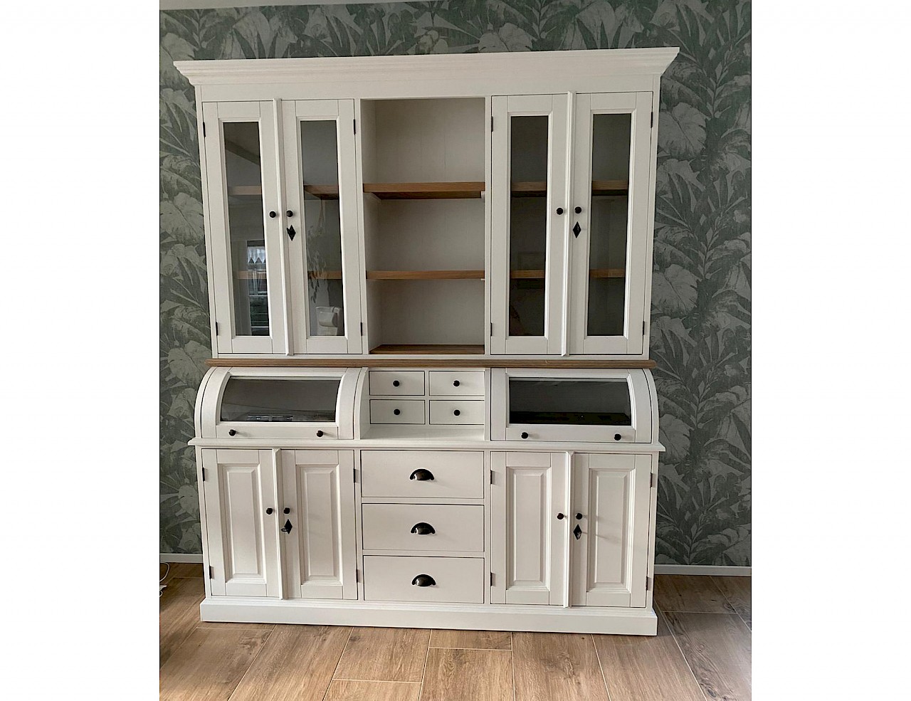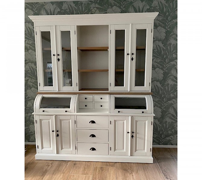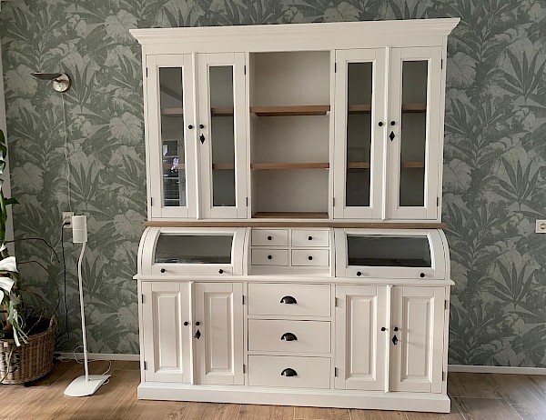 Deze prachtige buffetkast Bastiaan heeft een geweldige uitstraling. iteraard bestaat de kast uit 2 delen, het bovenste gedeelte valt achter een sierlijst in het onderste gedeelte. De afwerking is glad gespoten, hoogwaardige kwaliteit: softclosing op de lades, en afsluitbare deuren!