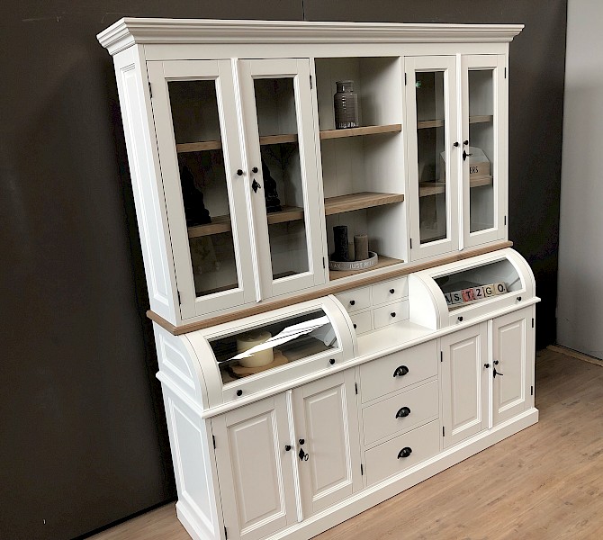 Deze prachtige buffetkast Bastiaan 220cm heeft een geweldige uitstraling. iteraard bestaat de kast uit 2 delen, het bovenste gedeelte valt achter een sierlijst in het onderste gedeelte. De afwerking is glad gespoten, en hoogwaardige kwaliteit: softclosing op de lades, en afsluitbare deuren!
