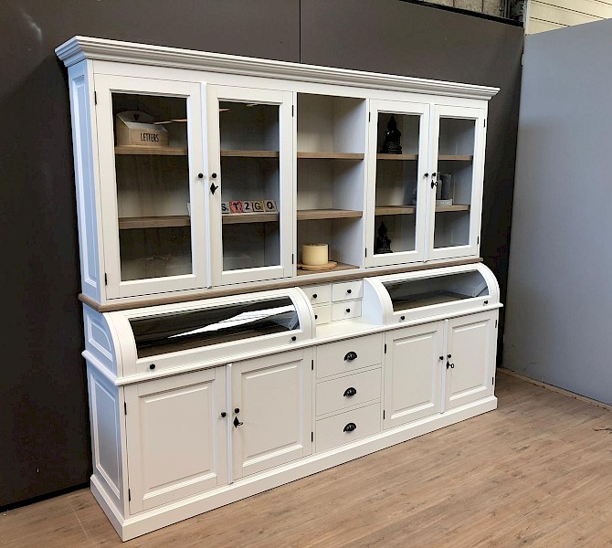 Deze prachtige buffetkast Bastiaan 240cm heeft een geweldige uitstraling. iteraard bestaat de kast uit 2 delen, het bovenste gedeelte valt achter een sierlijst in het onderste gedeelte. De afwerking is glad gespoten, en hoogwaardige kwaliteit: softclosing op de lades, en afsluitbare deuren!