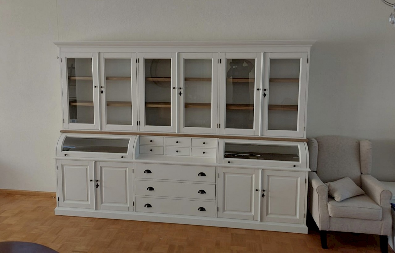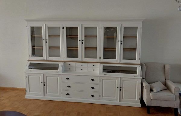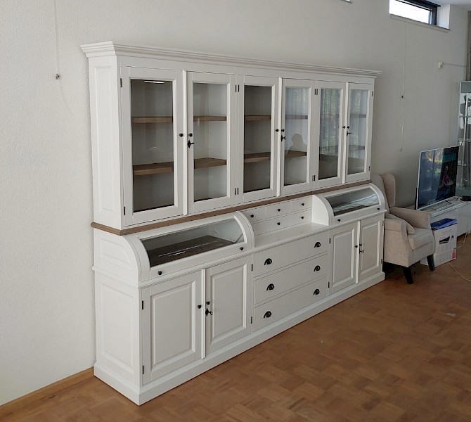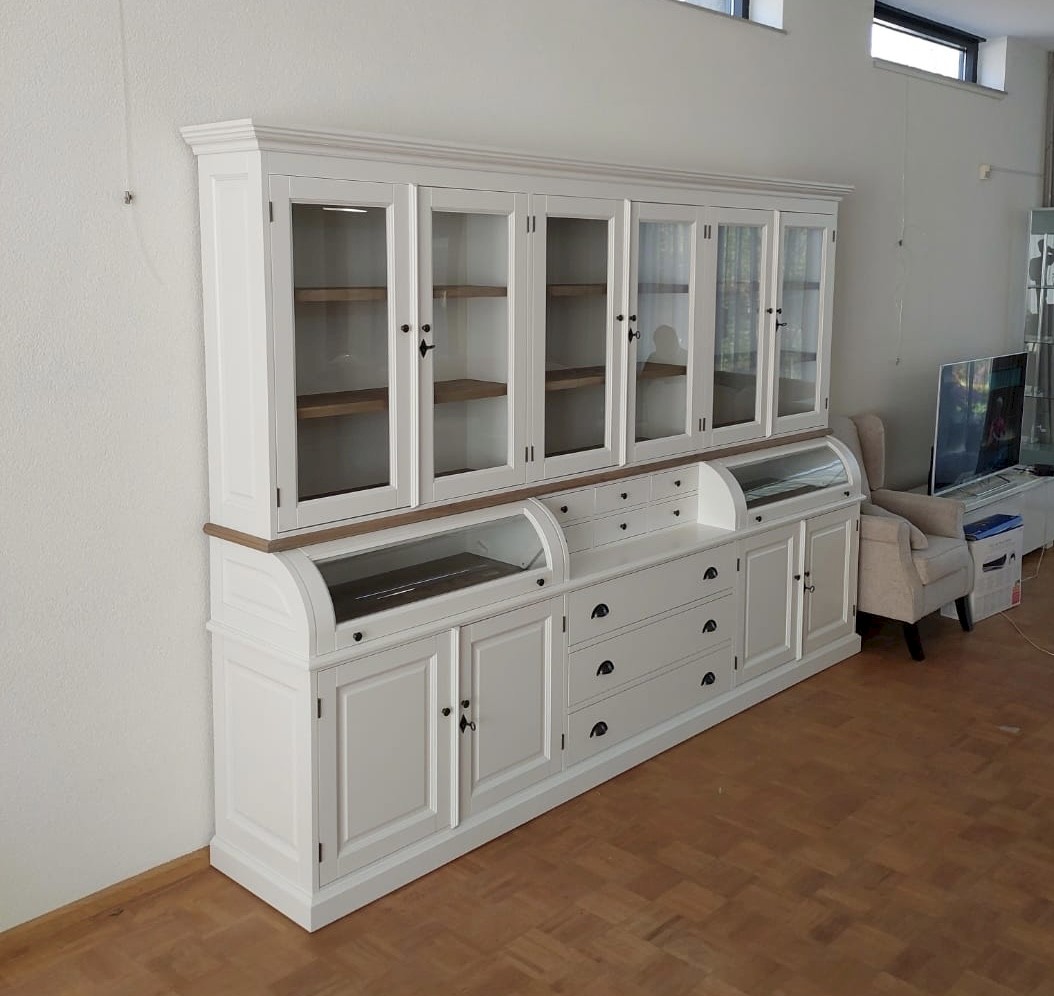 Deze prachtige buffetkast Bastiaan heeft een geweldige uitstraling. Uiteraard bestaat de kast uit 2 delen, het bovenste gedeelte valt achter een sierlijst in het onderste gedeelte. De afwerking is glad gespoten, en hoogwaardige kwaliteit: softclosing op de lades, en afsluitbare deuren!