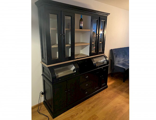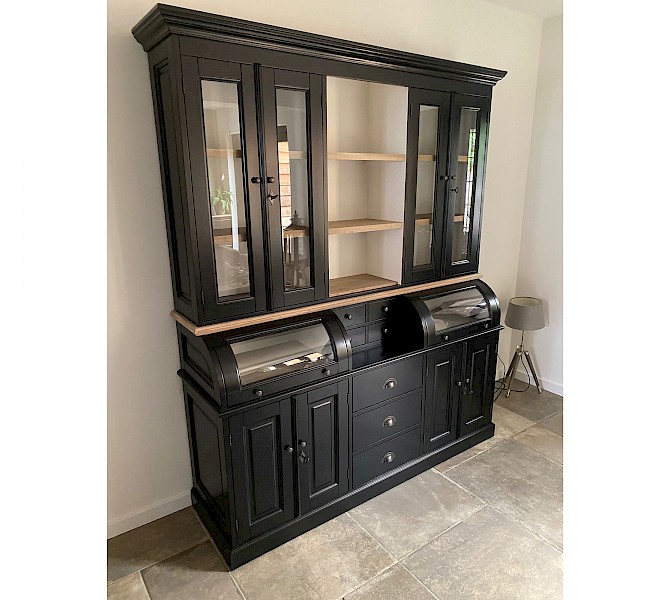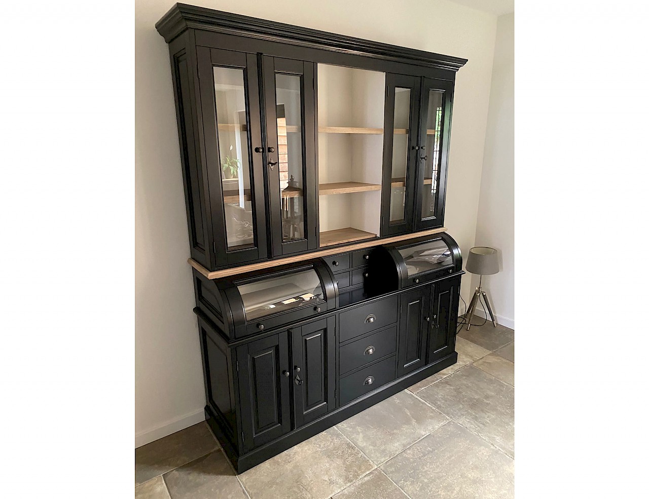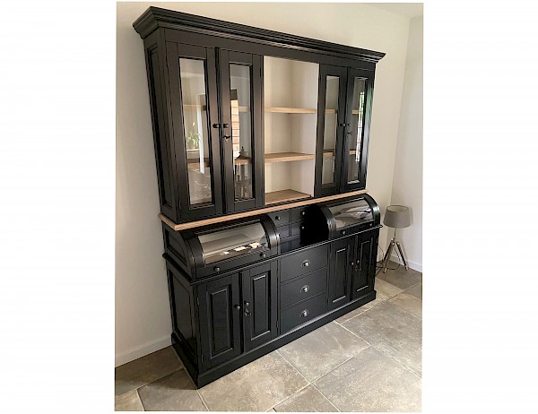 Deze prachtige buffetkast Bastiaan heeft een geweldige uitstraling. Uiteraard bestaat de kast uit 2 delen, het bovenste gedeelte valt achter een sierlijst in het onderste gedeelte. De afwerking is glad gespoten, en hoogwaardige kwaliteit: softclosing op de lades, en afsluitbare deuren!