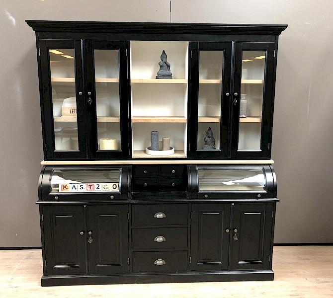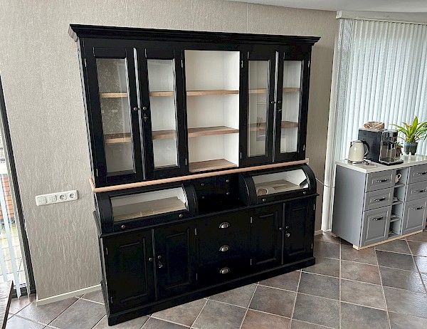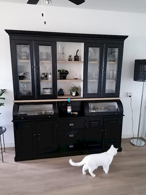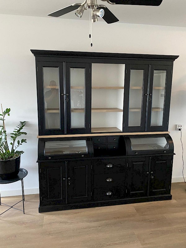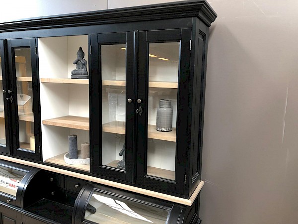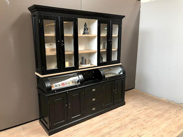 Deze prachtige buffetkast Bastiaan heeft een geweldige uitstraling. Uiteraard bestaat de kast uit 2 delen, het bovenste gedeelte valt achter een sierlijst in het onderste gedeelte. De afwerking is glad gespoten, en hoogwaardige kwaliteit: softclosing op de lades, en afsluitbare deuren!