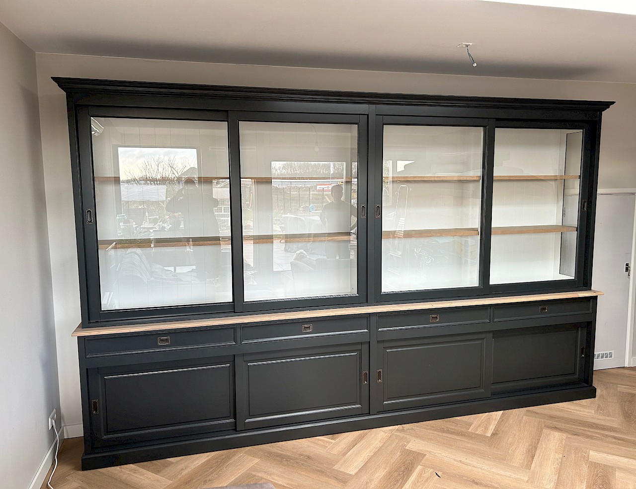 De schuifdeuren hangen in aluminium rails, glijden vloeiend en zweven als het ware. Op de lades is soft closing geinstalleerd,dus echt die luxe.