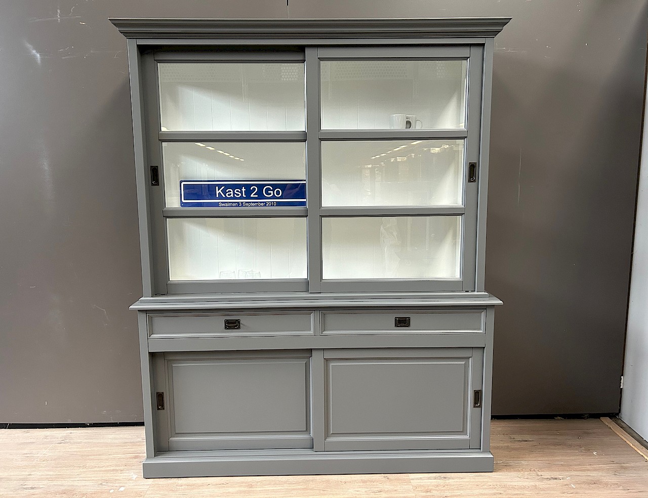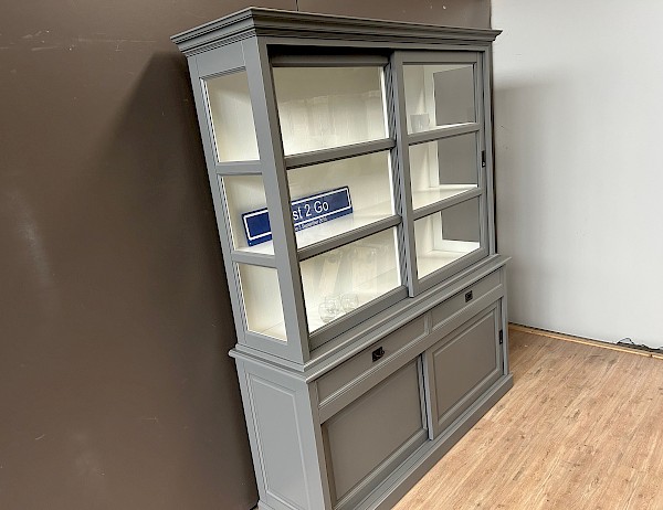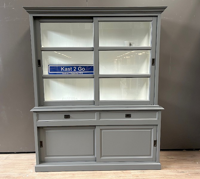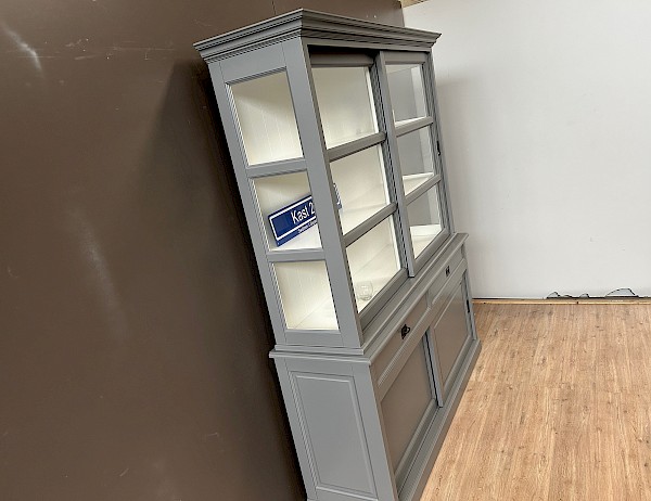 De zijkanten van de bovenkast zijn gemaakt van glas, wat zorgt voor een mooi uitzicht en licht in de kast.