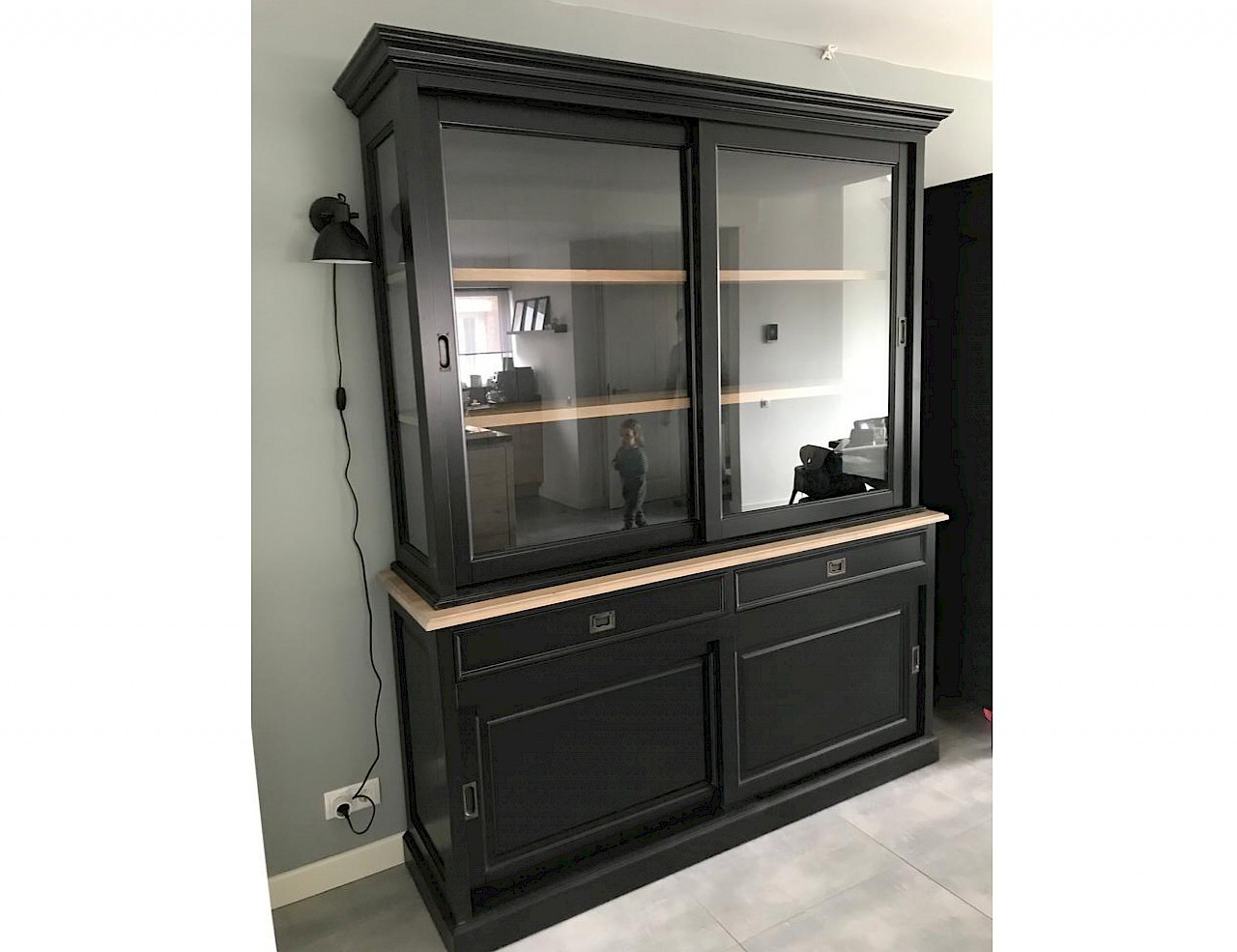De schuifdeuren hangen in aluminium rails, glijden vloeiend en zweven als het ware. Op de lades is soft closing geinstalleerd, dus nog meer gevoel van echte luxe. De zijkanten van de bovenkast zijn gemaakt van glas, wat zorgt voor een mooi uitzicht en licht in de kast.