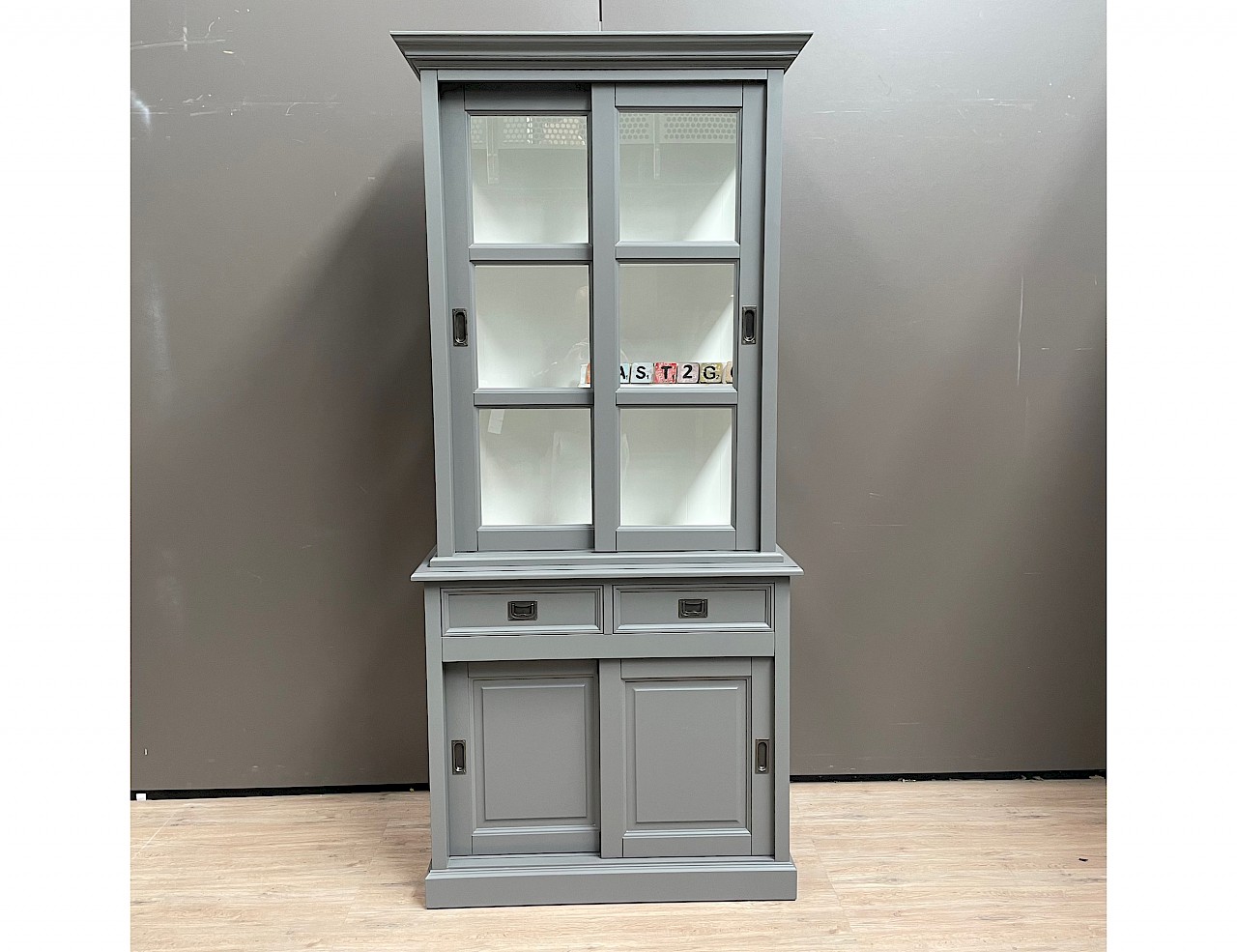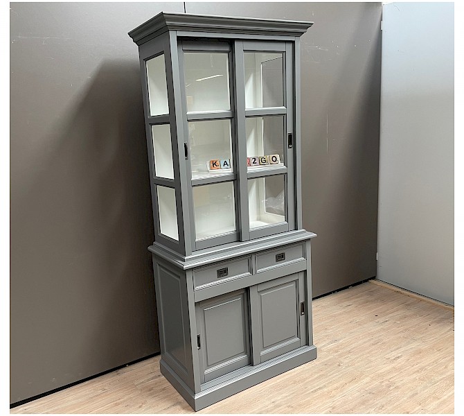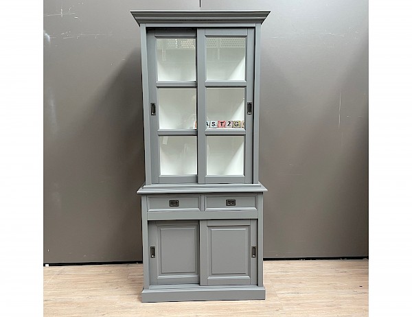 De zijkanten van de bovenkast zijn gemaakt van glas, wat zorgt voor een mooi uitzicht en licht in de kast.