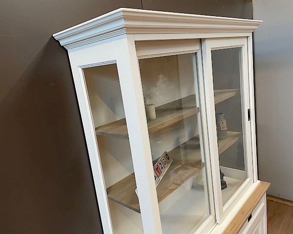 De schuifdeuren hangen in aluminium rails, glijden vloeiend en zweven als het ware. Op de lades is soft closing geinstalleerd, dus nog meer gevoel van echte luxe. De zijkanten van de bovenkast zijn gemaakt van glas, wat zorgt voor een mooi uitzicht en licht in de kast.