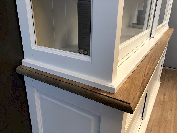 De schuifdeuren hangen in aluminium rails, glijden vloeiend en zweven als het ware. Op de lades is soft closing geinstalleerd, dus nog meer gevoel van echte luxe. De zijkanten van de bovenkast zijn gemaakt van glas, wat zorgt voor een mooi uitzicht en licht in de kast.