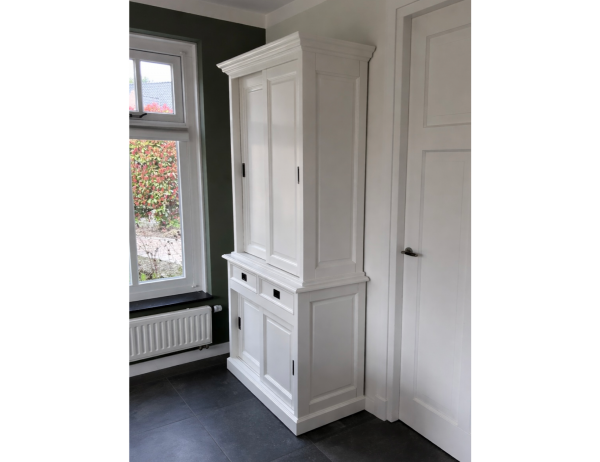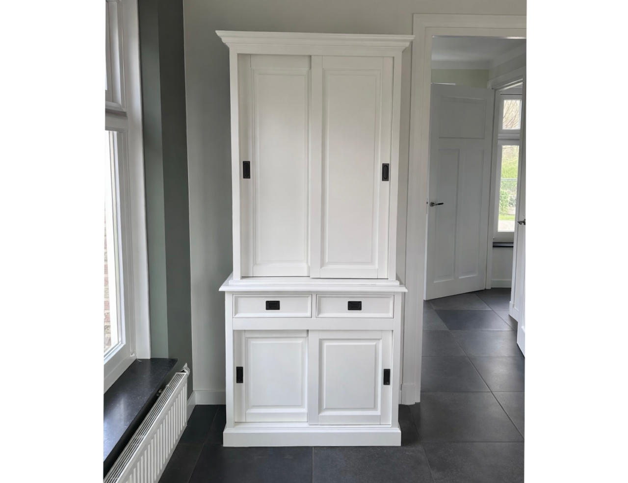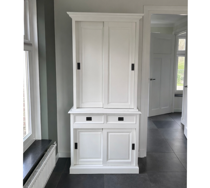 Deze aantrekkelijke glad gespoten kast biedt veel opbergruimte voor items die je onzichtbaar zou willen in de onderkast én bovenkast, daarom speciaal alle deuren dicht. De schuifdeuren hangen in aluminium rails, glijden vloeiend en zweven als het ware.Op de lades is soft closing geinstalleerd,dus echt die luxe.
