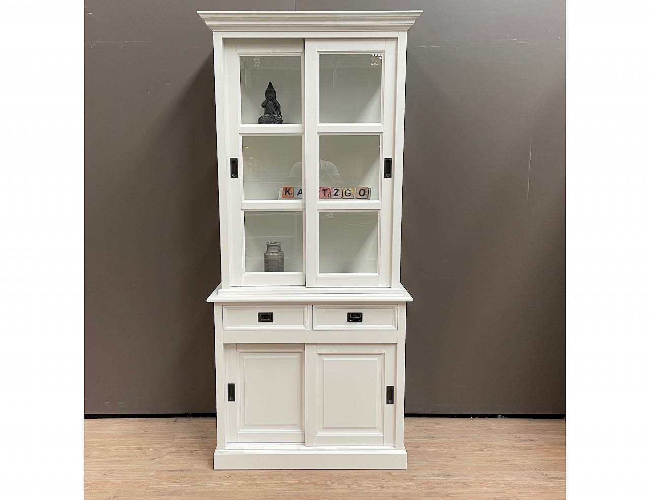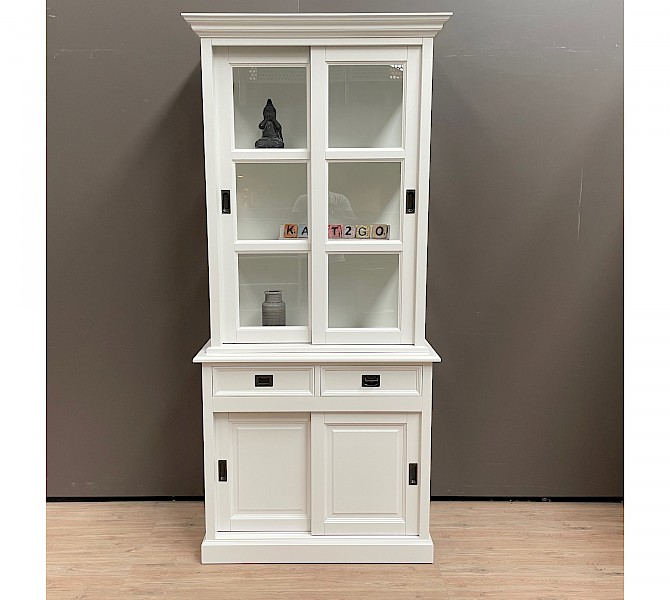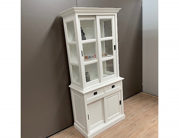 De schuifdeuren hangen in aluminium rails, glijden vloeiend en zweven als het ware.Op de lades is soft closing geinstalleerd,dus echt die luxe. De zijkanten van de bovenkast zijn gemaakt van glas, wat zorgt voor een mooi uitzicht en licht in de kast.