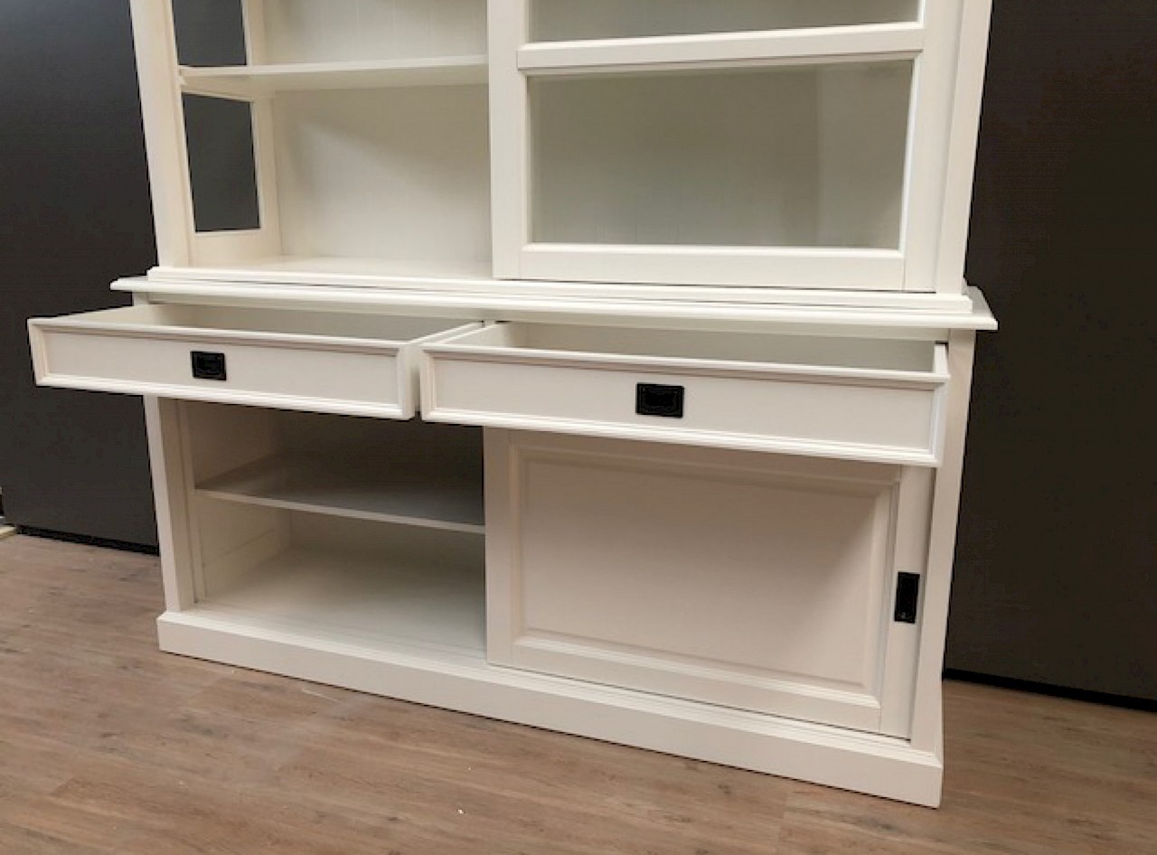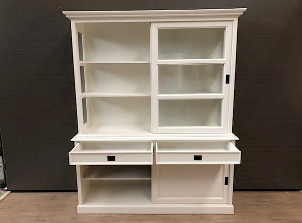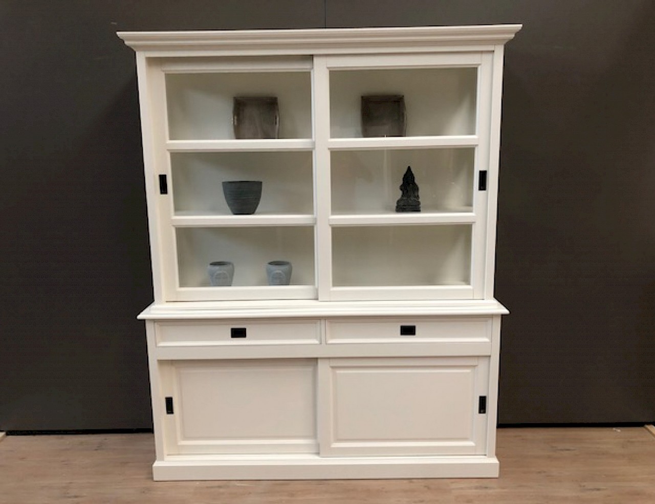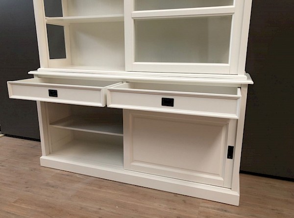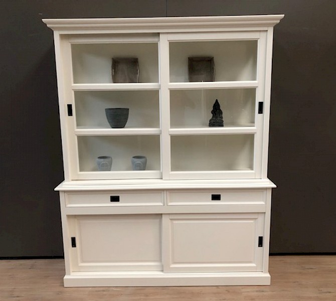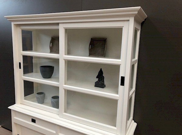 De zijkanten van de bovenkast zijn gemaakt van glas, wat zorgt voor een mooi uitzicht en licht in de kast.