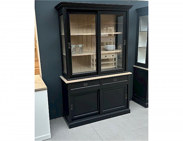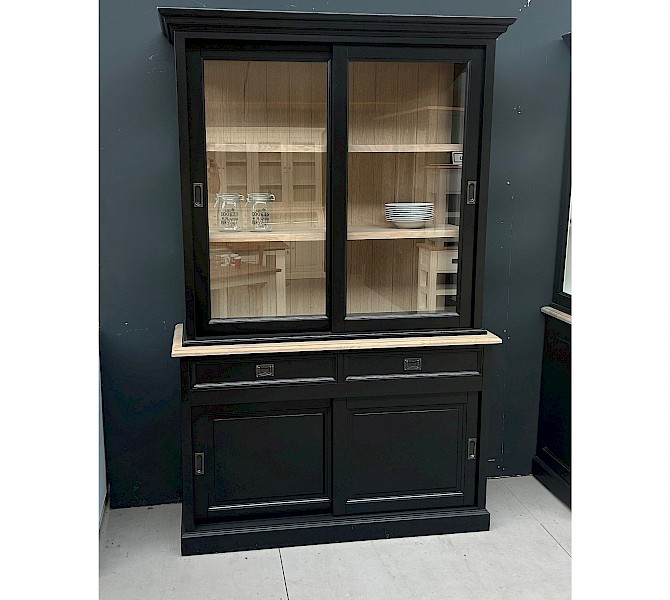 De zijkanten van de bovenkast zijn gemaakt van glas, wat zorgt voor een mooi uitzicht en licht in de kast.