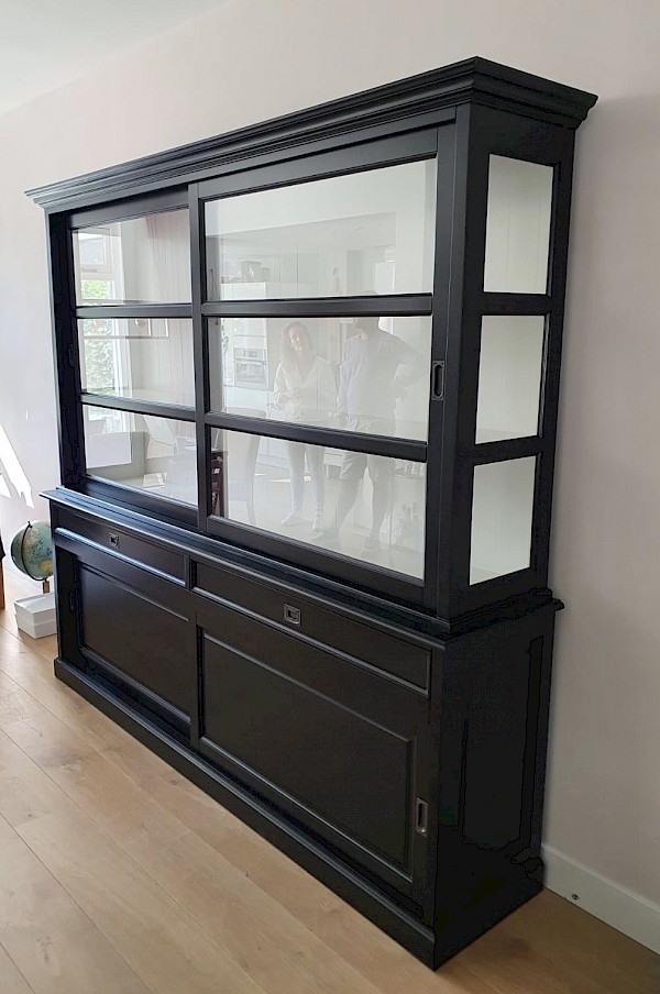 De zijkanten van de bovenkast zijn gemaakt van glas, wat zorgt voor een mooi uitzicht en licht in de kast.