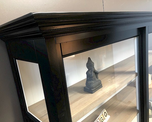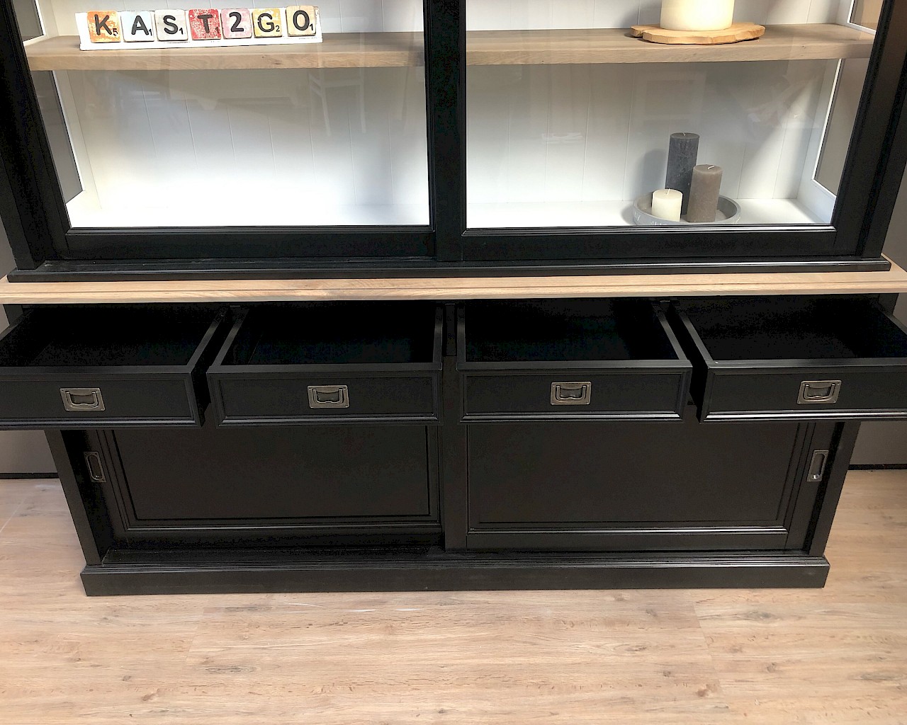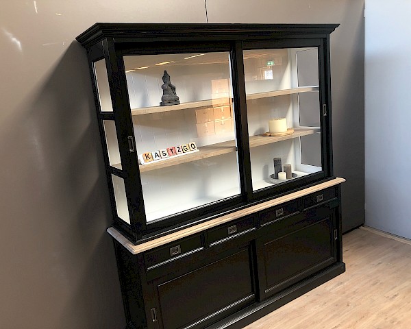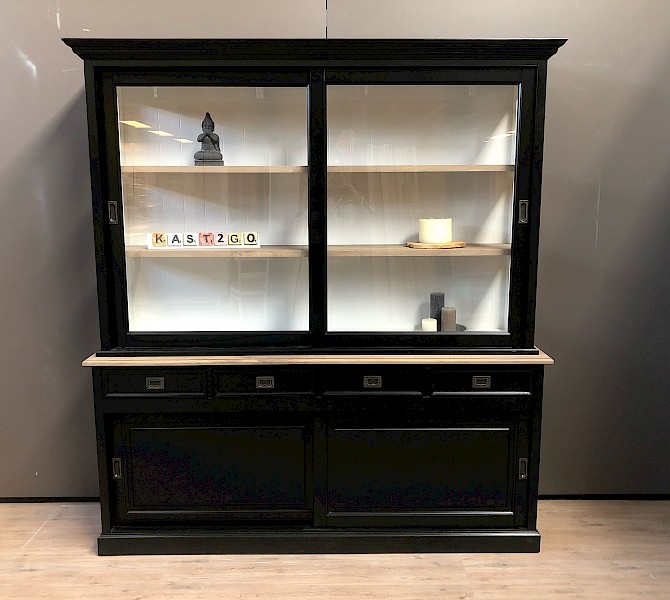 De zijkanten van de bovenkast zijn gemaakt van glas, wat zorgt voor een mooi uitzicht en licht in de kast.