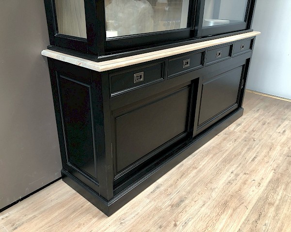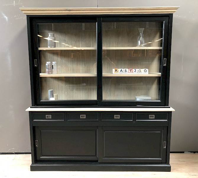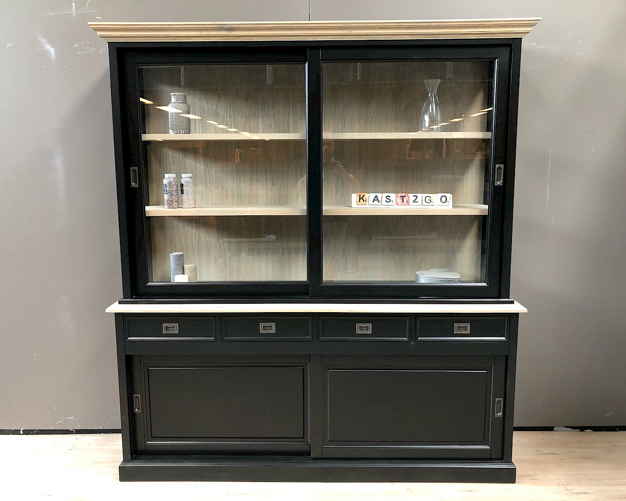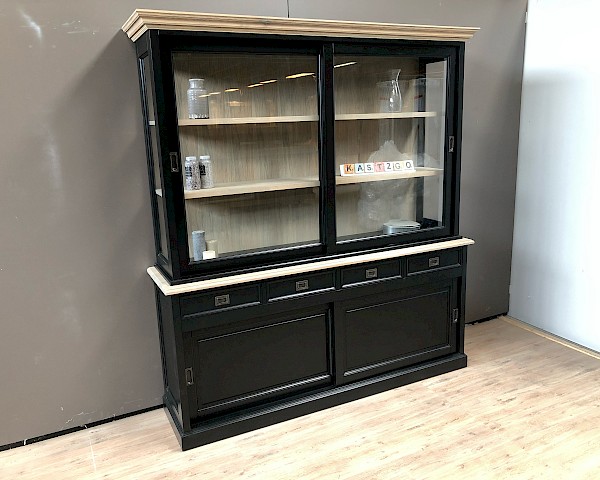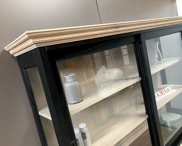 De zijkanten van de bovenkast zijn gemaakt van glas, wat zorgt voor een mooi uitzicht en licht in de kast.