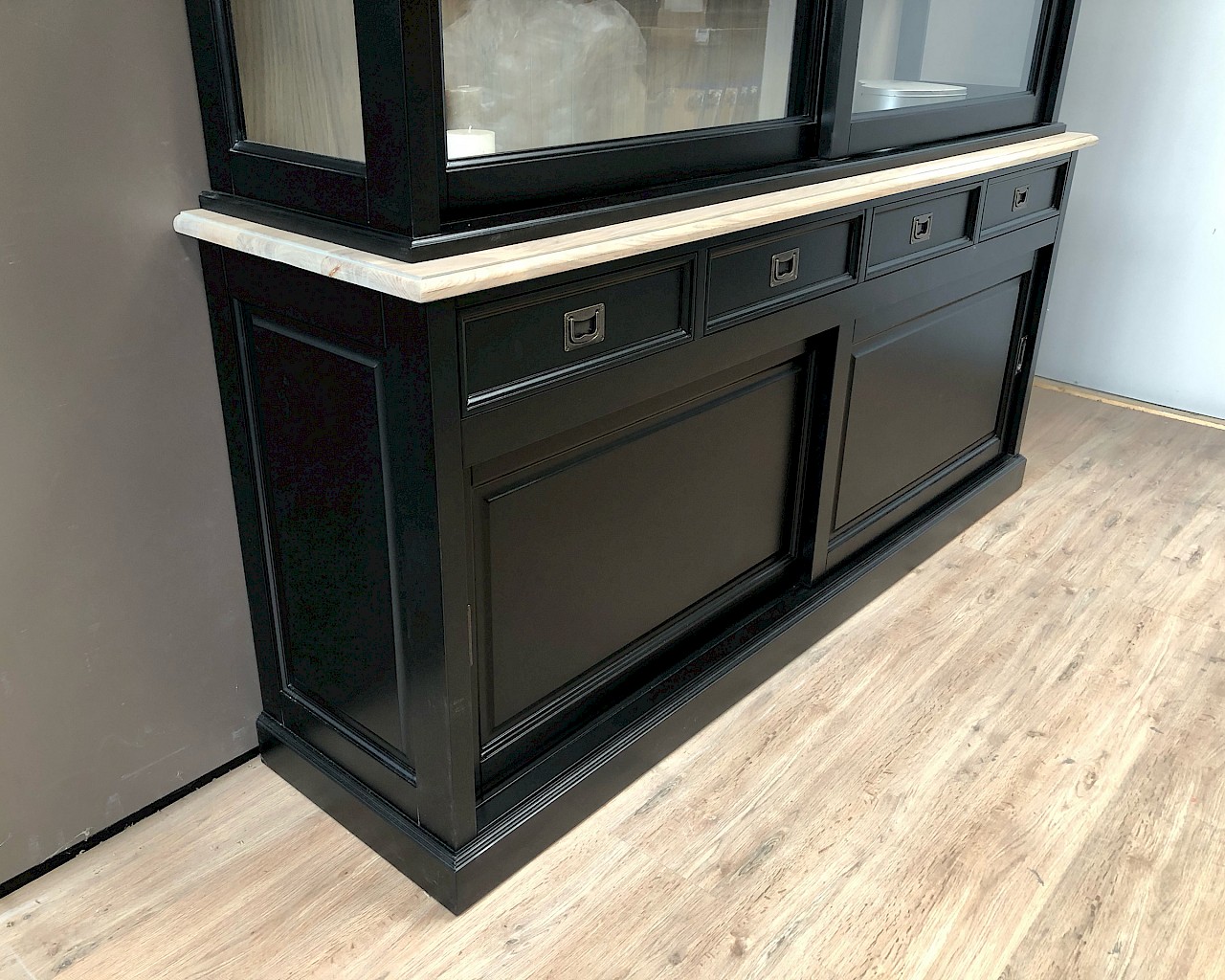 Deze aantrekkelijke glad gespoten kast in het zwart biedt veel opbergruimte voor items die je onzichtbaar zou willen in de onderkast, en je kunt je persoonlijke bezittingen weergeven in het glazen gedeelte van de buffetkast.