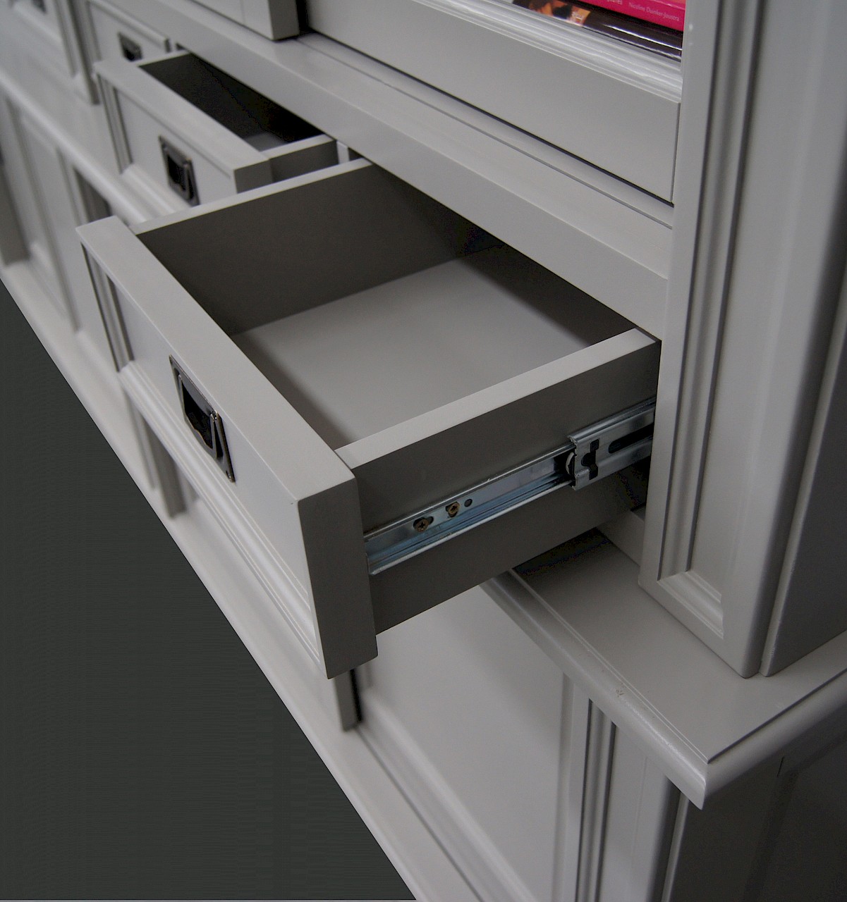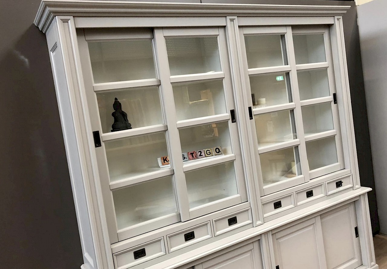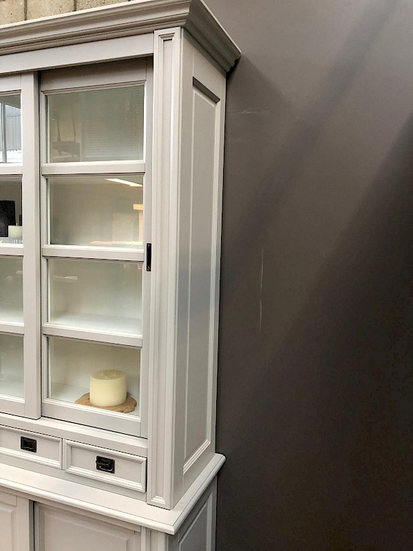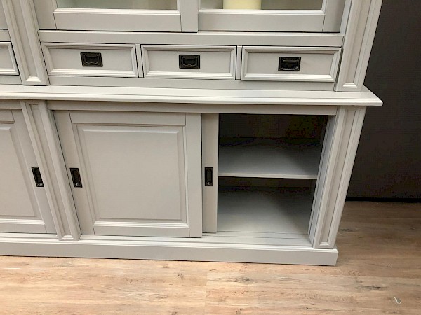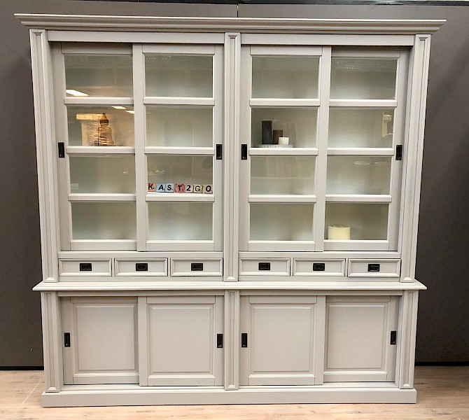 Deze buffetkast is grey wash buiten en white wash binnen, glad gespoten. Het boven gedeelte bestaat uit 2 gedeelte en een koplijst. De kast bevat zowel boven als beneden 4 schuifdeurtjes, daarnaast heeft de kast 6 lades. Een prachtige vitrinekast die zowel in een klassiek als een modern interieur past. De kast kan met verschillende kleuren aan de binnenkant gekozen worden, bijv antraciet / black/ white achtergrond. De kast kan ook in zwart als buitenkleur gekozen worden. De lades lopen op ijzeren geleiders en de deuren zweven in een ijzeren rails, kwaliteit dus!