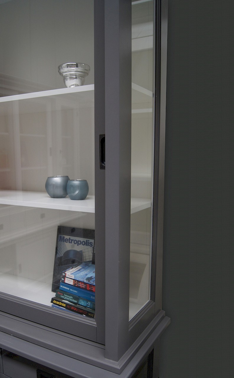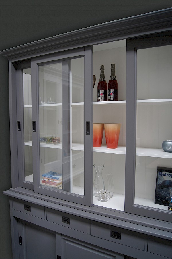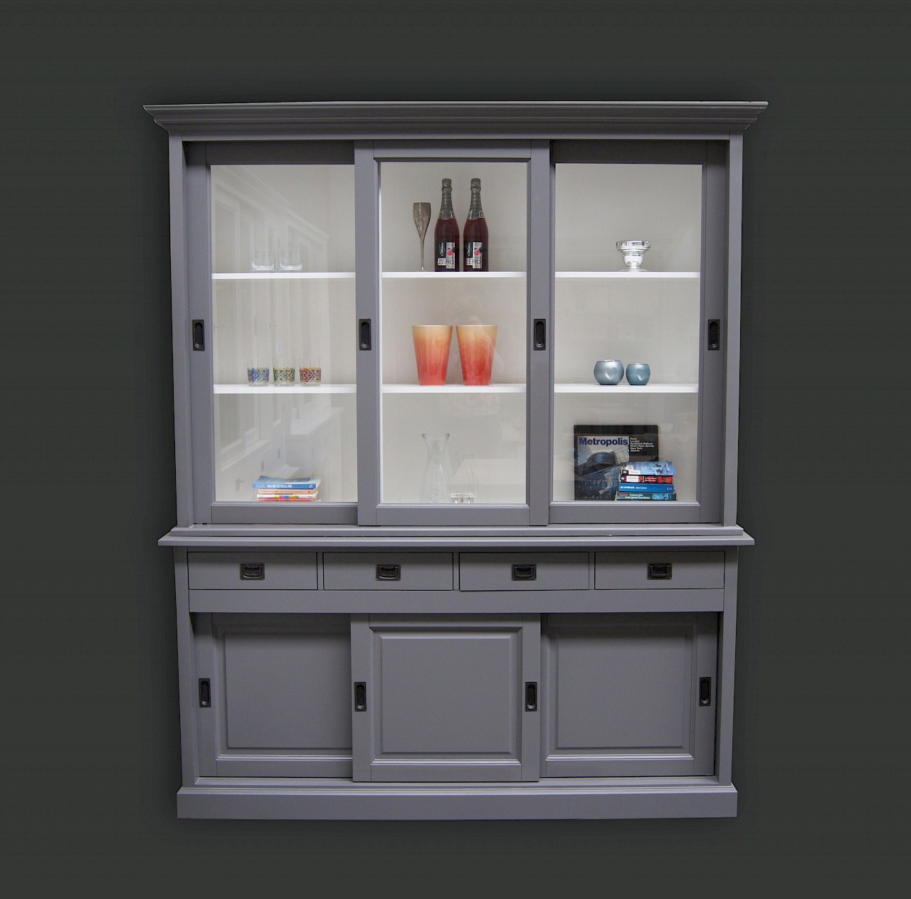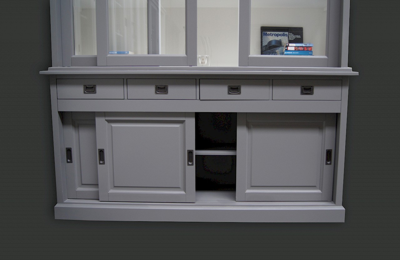 Deze prachtige grijze buffetkastkast kan de blikvanger zijn in uw woonruimte! Een tijdloze uitstraling waardoor deze zowel in een modern als klassiek interieur past. De kast bevat 3 schuifdeuren, zowel boven als onder, daarnaast een aantal lades. Vervaardiging is uitgevoerd met hoge kwaliteit, waardoor lades schuiven op geleiders en deuren hangen in een ijzeren rails. Deze mooie kast bestaat uit 2 gedeeltes, waardoor makkelijk te vervoeren. De diepte van schappen: 29 boven en 32 onder.