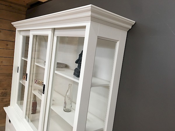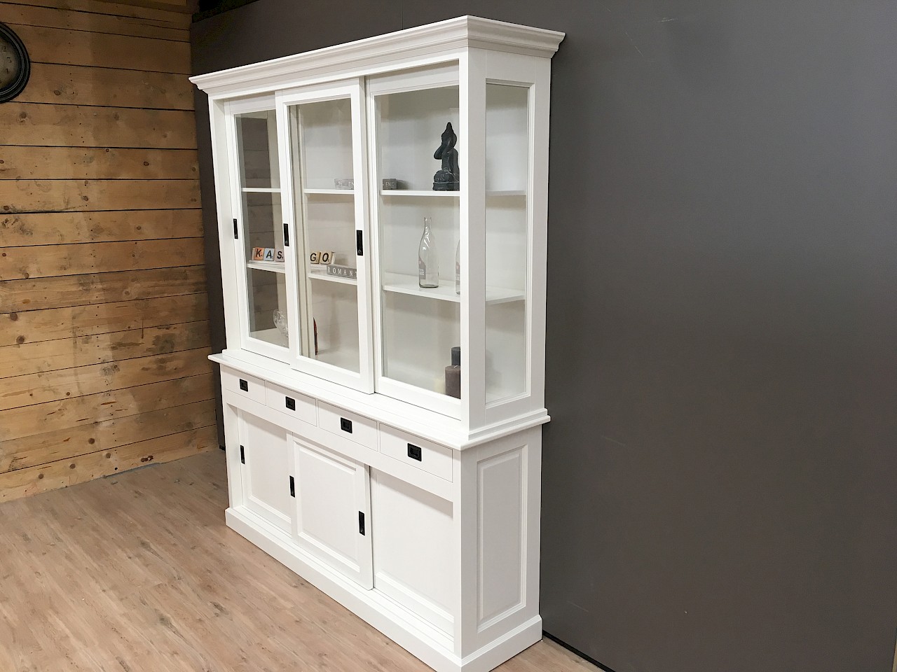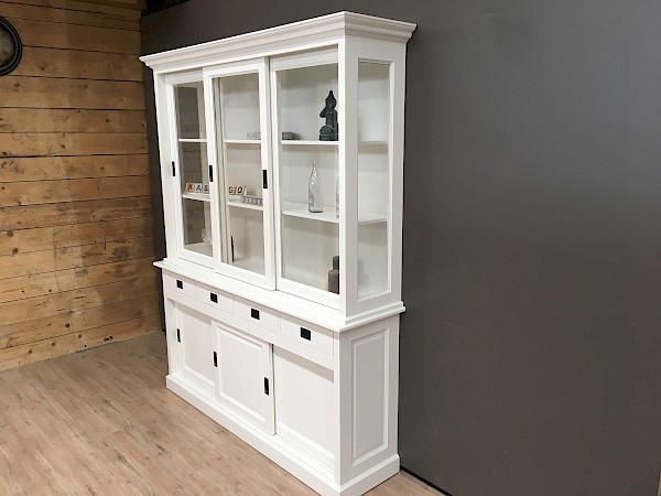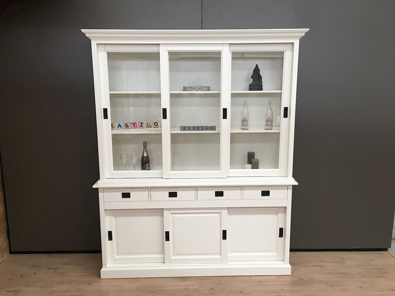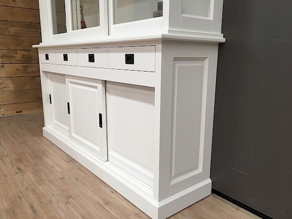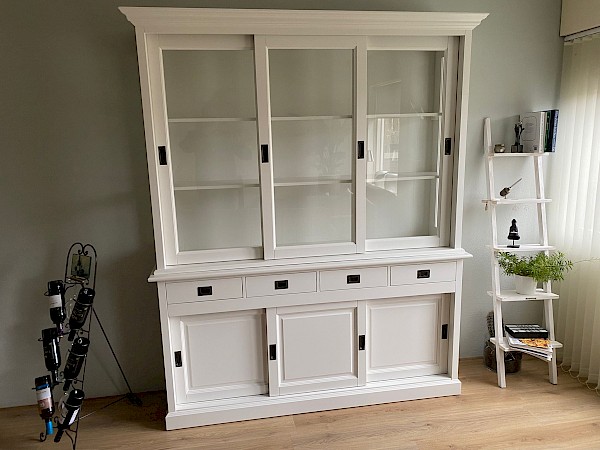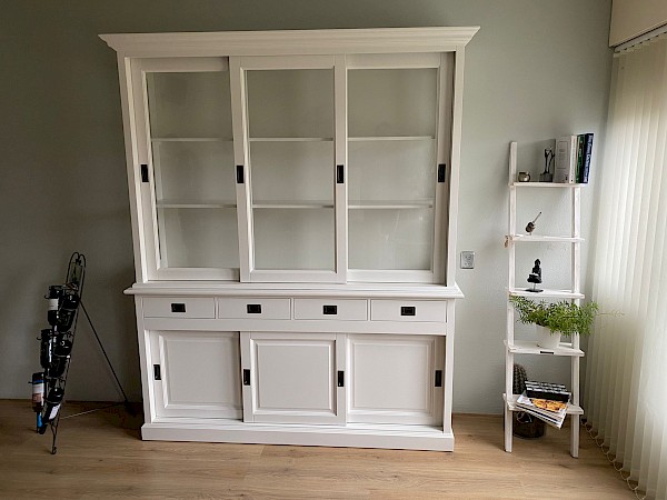 Deze prachtige  buffetkast kan de blikvanger zijn in uw woonruimte! Een tijdloze uitstraling waardoor deze zowel in een modern als klassiek interieur past. De kast bevat 3 schuifdeuren, zowel boven als onder, daarnaast een aantal lades. Vervaardiging is uitgevoerd met hoge kwaliteit, waardoor lades schuiven op geleiders en deuren hangen in een ijzeren rails. Deze mooie kast bestaat uit 2 gedeeltes, waardoor makkelijk te vervoeren. De diepte van schappen: 29 boven en 32 onder.
