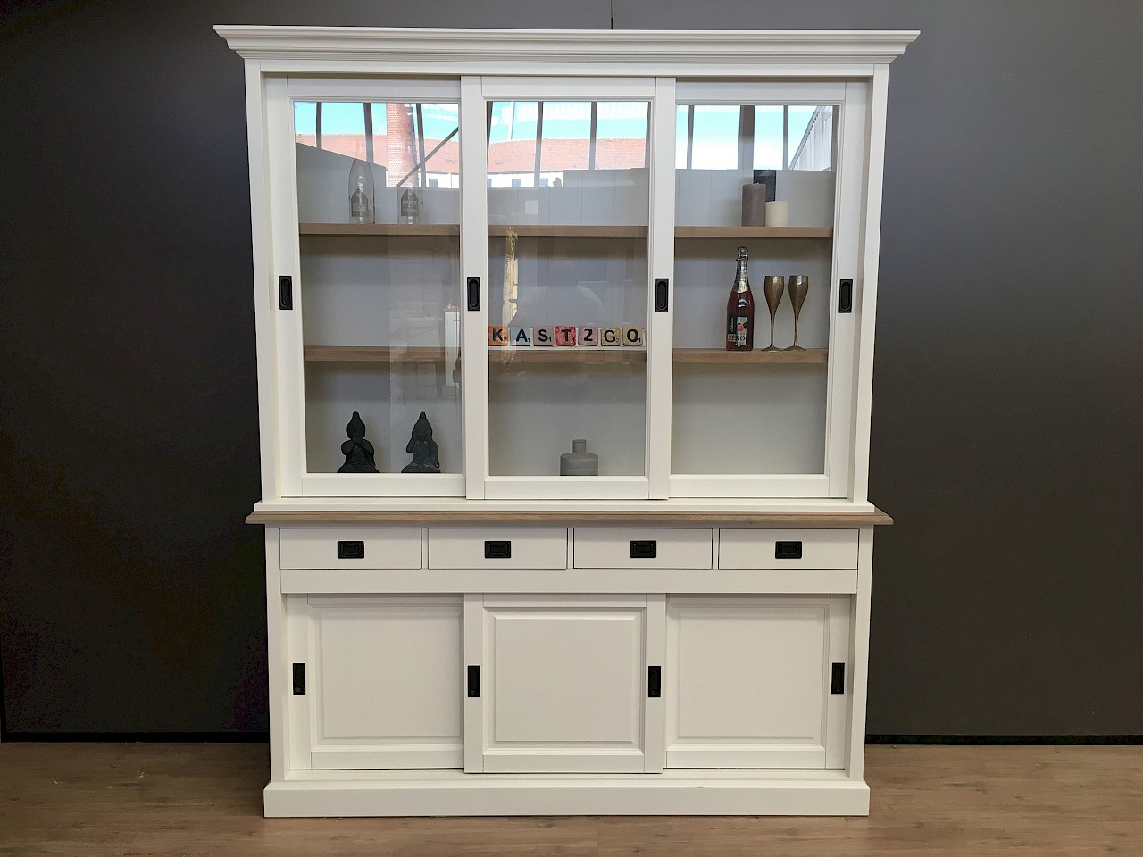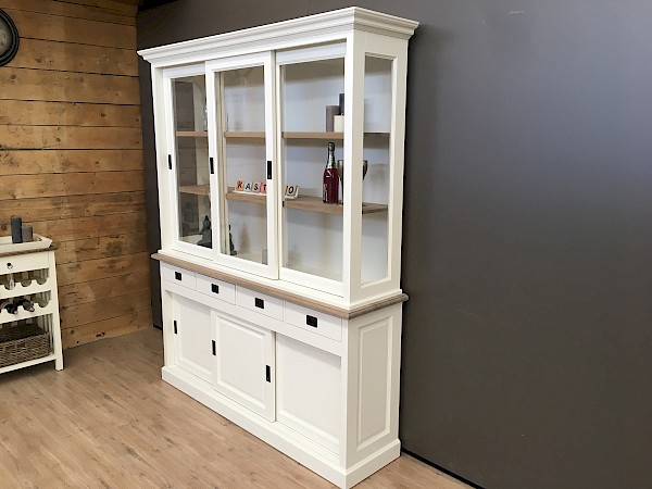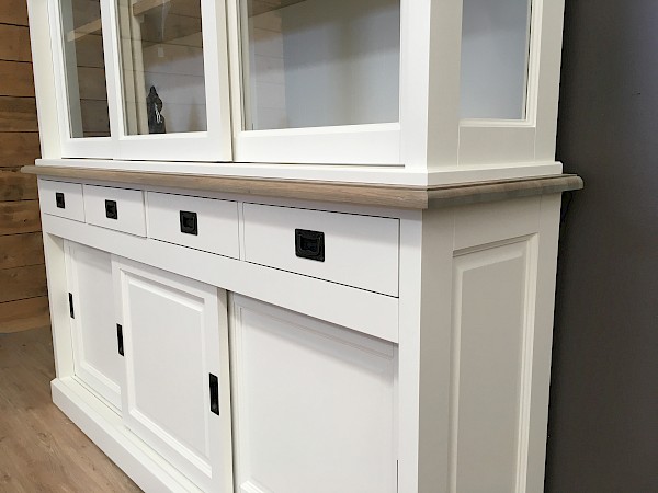 Deze prachtige buffetkast kan de blikvanger zijn in uw woonruimte! Een tijdloze uitstraling waardoor deze zowel in een modern als klassiek interieur past. De kast bevat 3 schuifdeuren, zowel boven als onder, daarnaast een aantal lades. Vervaardiging is uitgevoerd met hoge kwaliteit, waardoor lades dicht gaan met een soft close systeem en deuren schuiven op een rails. Deze mooie kast bestaat uit 2 gedeeltes, waardoor makkelijk te vervoeren. De schappen en zetplank zijn van gerookt eiken gemaakt, waardoor er een prachtig warm effect ontstaat. Unieke combinatie.