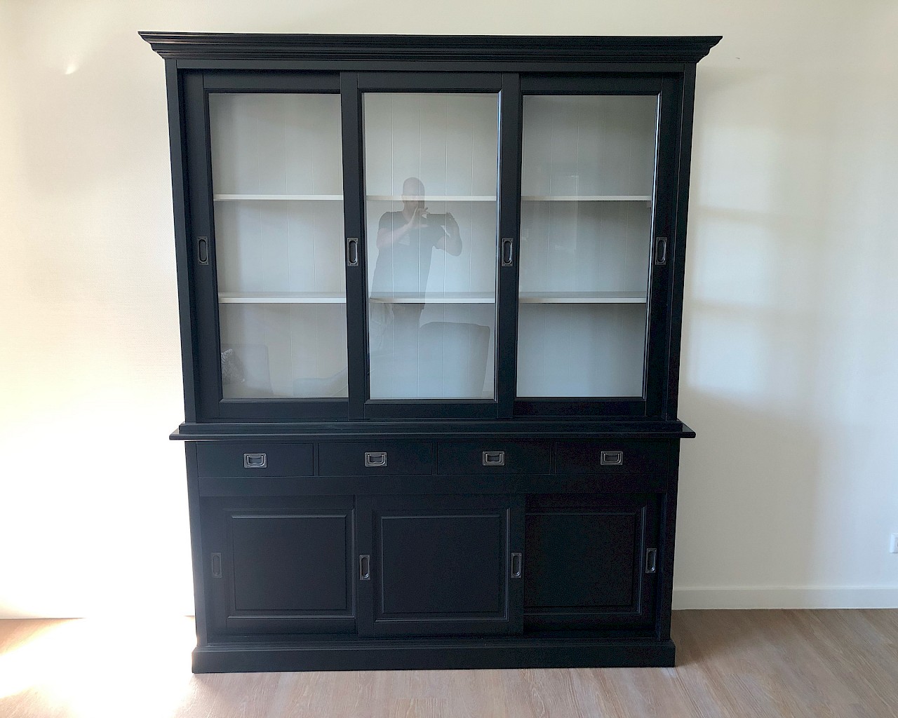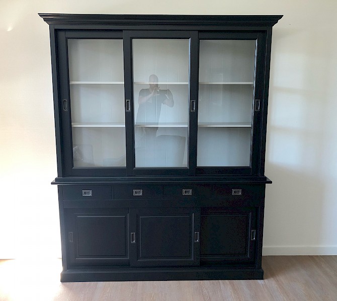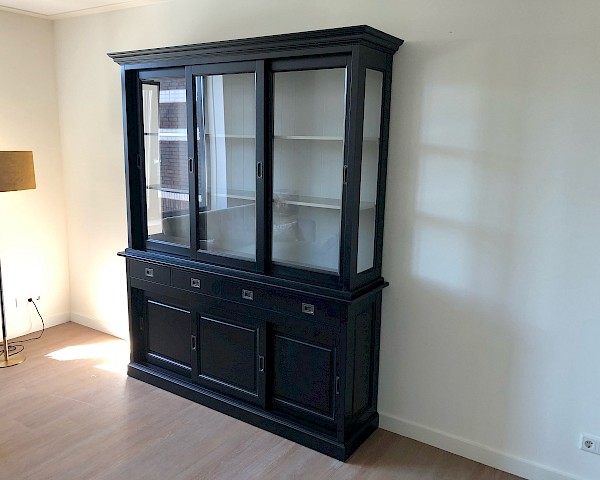 Deze prachtige zwarte buffetkastkast kan de blikvanger zijn in uw woonruimte! Een tijdloze uitstraling waardoor deze zowel in een modern als klassiek interieur past. De kast bevat 3 schuifdeuren, zowel boven als onder, daarnaast een aantal lades. Vervaardiging is uitgevoerd met hoge kwaliteit, waardoor lades schuiven op geleiders en deuren hangen in een ijzeren rails. Deze mooie kast bestaat uit 2 gedeeltes, waardoor makkelijk te vervoeren. De diepte van schappen: 29 boven en 32 onder.